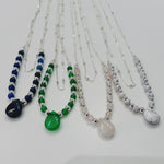 Introducing our exquisite crystal necklaces featuring a unique dual-strand design. Crafted with sterling silver, each necklace boasts a strand of beads with a stunning teardrop centerpiece, complemented by delicate silver accents. Inside, a second strand of delicate chain mirrors the silver detailing. Available in four mesmerising crystals: White Jasper, Rose Quartz, Lapis, and Green Aventurine. Hurry, with only one of each available, secure your favourite now!