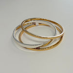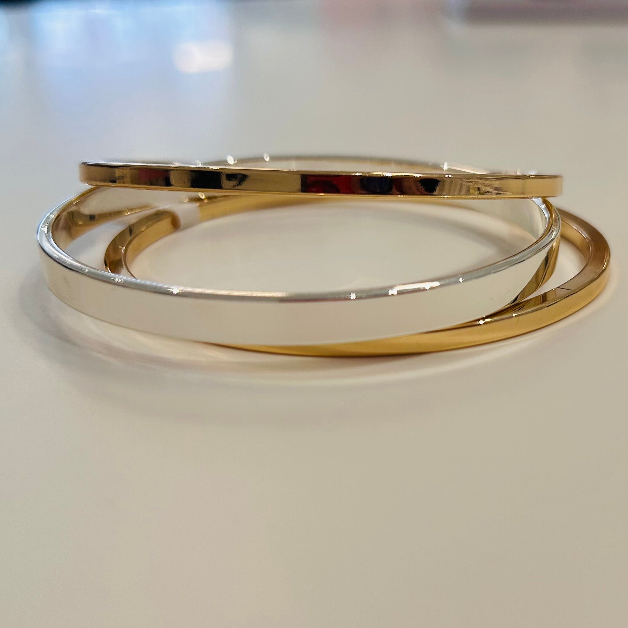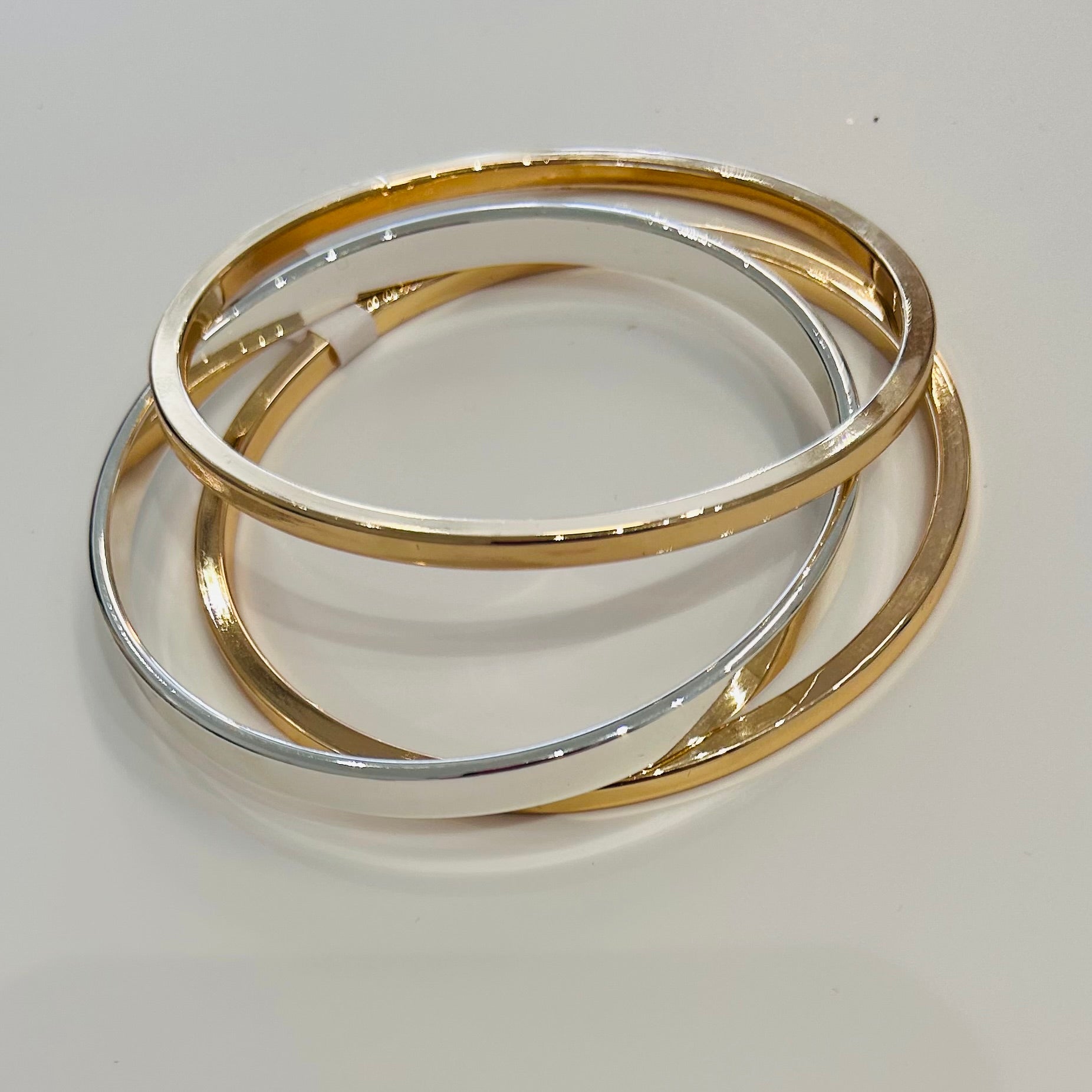 This striking nesting set includes three solid bangles—two sleek gold coloured bangles and a slightly thicker silver coloured bangle designed to sit perfectly in the middle. The gold bangles measure approximately 5–8 mm in width, while the silver bangle features a bold 1 cm width for added contrast. With a diameter of 7 cm, this elegant set is designed to be worn together for a sophisticated layered look but can also be styled individually for versatile charm. A timeless combination of gold and silver to elevate any outfit.