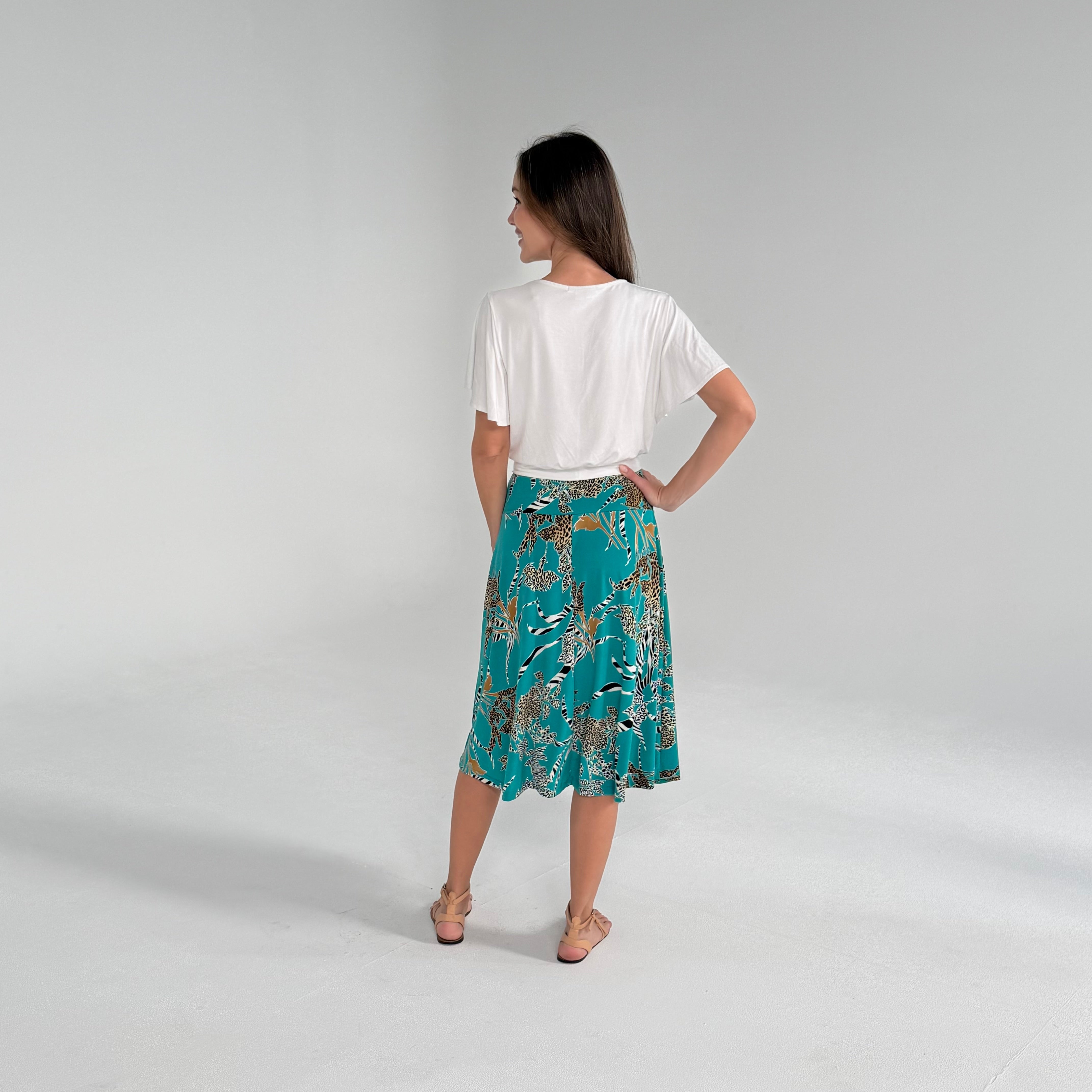Woman wearing a white top and teal floral skirt on a plain background