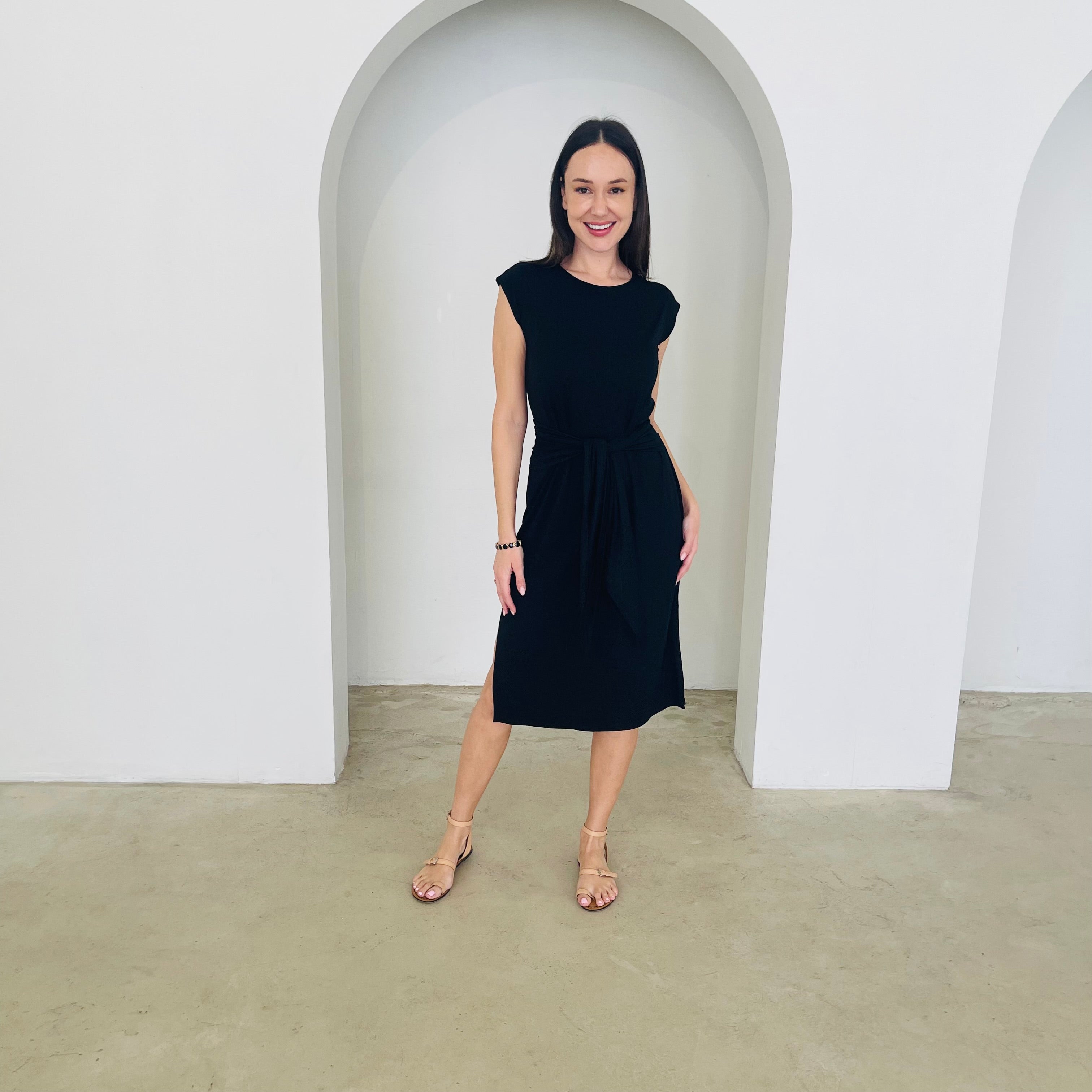 Woman wearing a black sleeveless dress standing in a white archway.