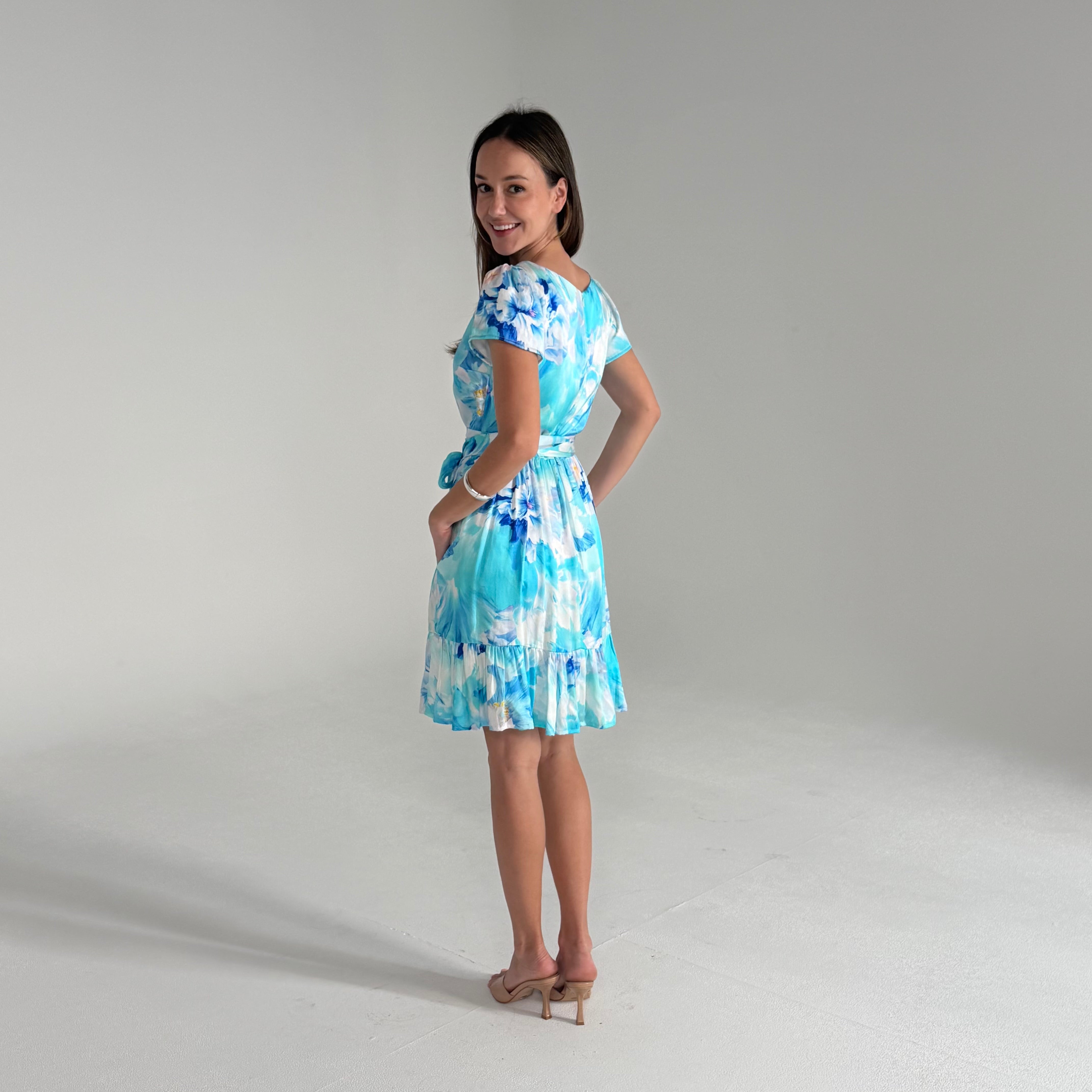 Crafted from lightweight, soft drape fabric, this dress features a flattering V-neckline, soft flutter sleeves, and a self-tie waist for a custom fit. Its vibrant blue and white abstract print is reminiscent of Mediterranean waters, making it the perfect choice for daytime events, garden parties, casual outings or an evening event.
