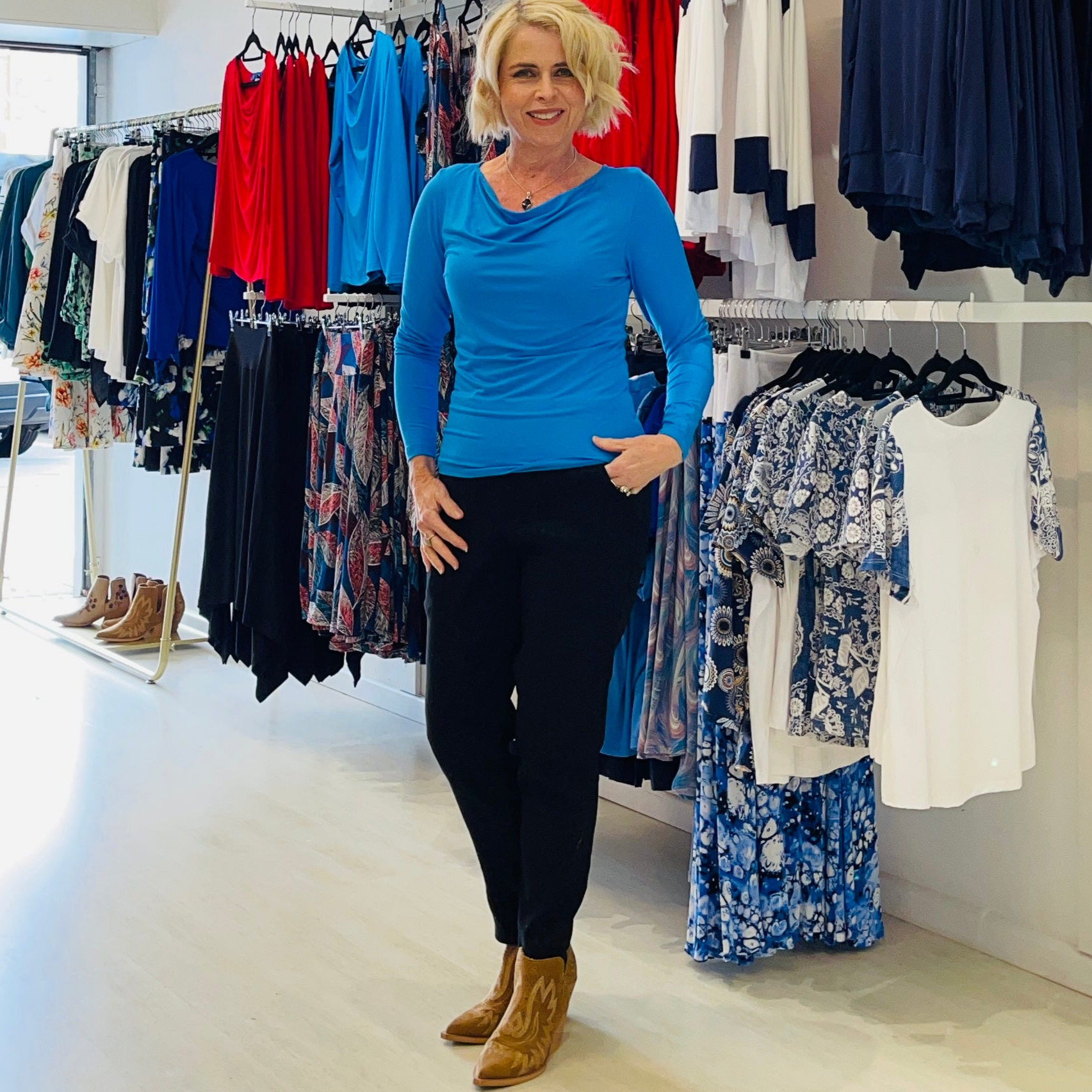 Mediterranean Blue Cowl Neck Long Sleeve Top