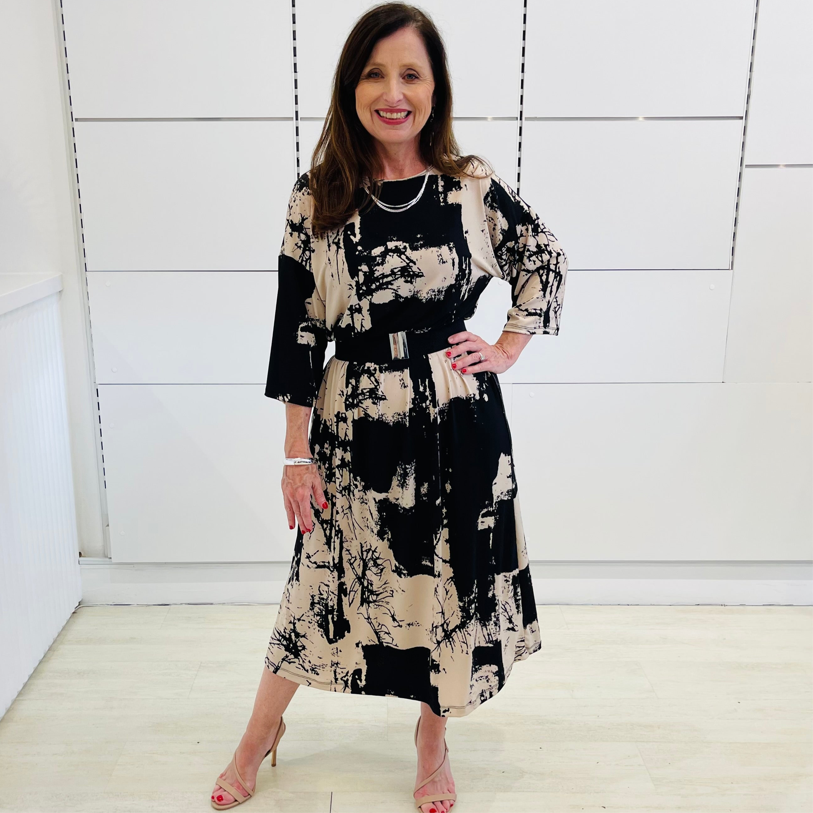Relaxed fit evening dress. Black and beige print, 3/4 sleeve, midi length dress for special event wear.