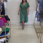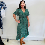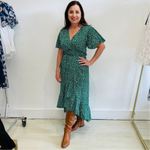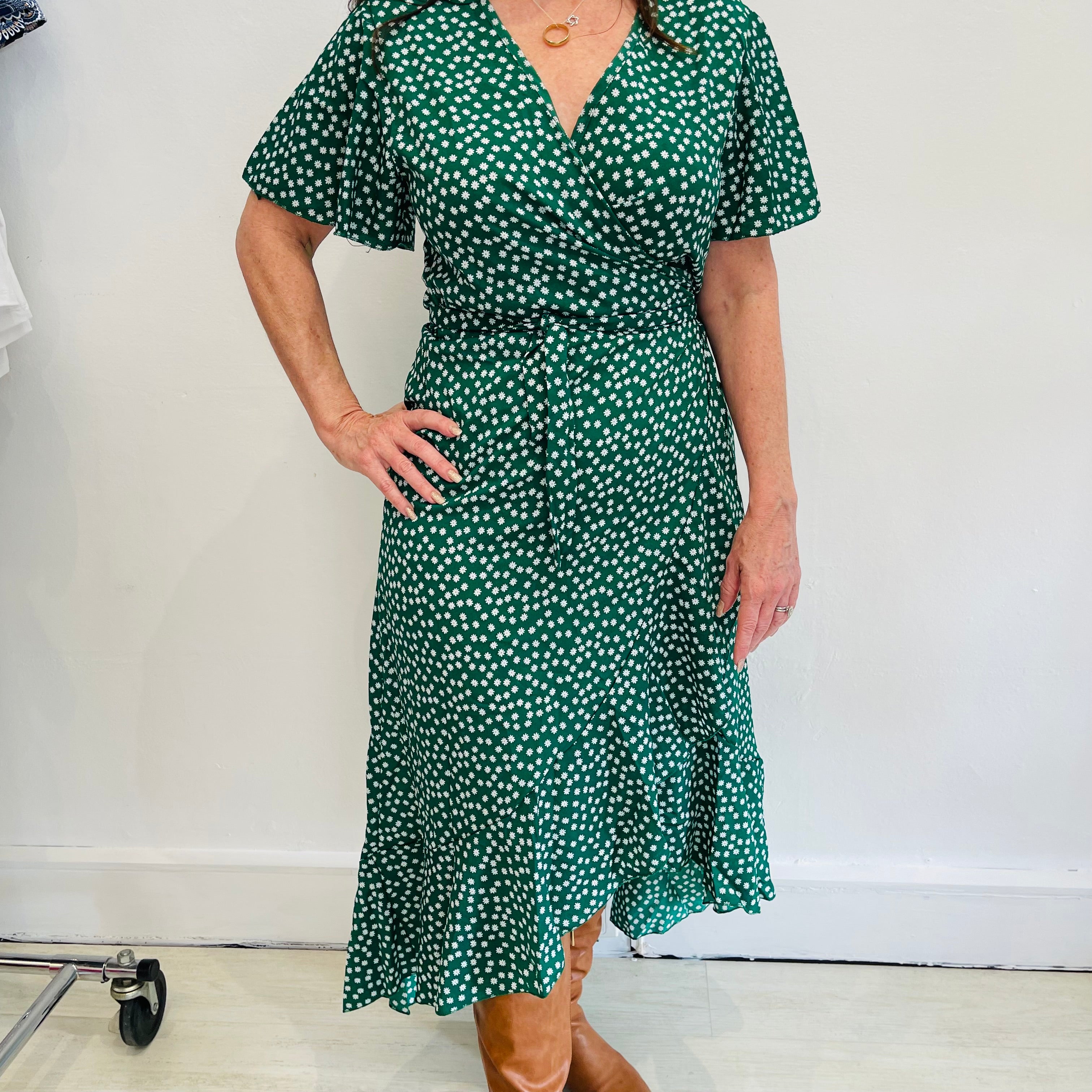 Introducing our stunning Emerald Green and White Daisy Print Wrap-Around Dress, the epitome of spring and summer elegance. This dress exudes timeless beauty, featuring delicate daisies on a vibrant emerald green canvas. With its feminine frill sleeves and a subtle hemline that gracefully peaks at the front, this dress combines charm and style effortlessly.
