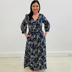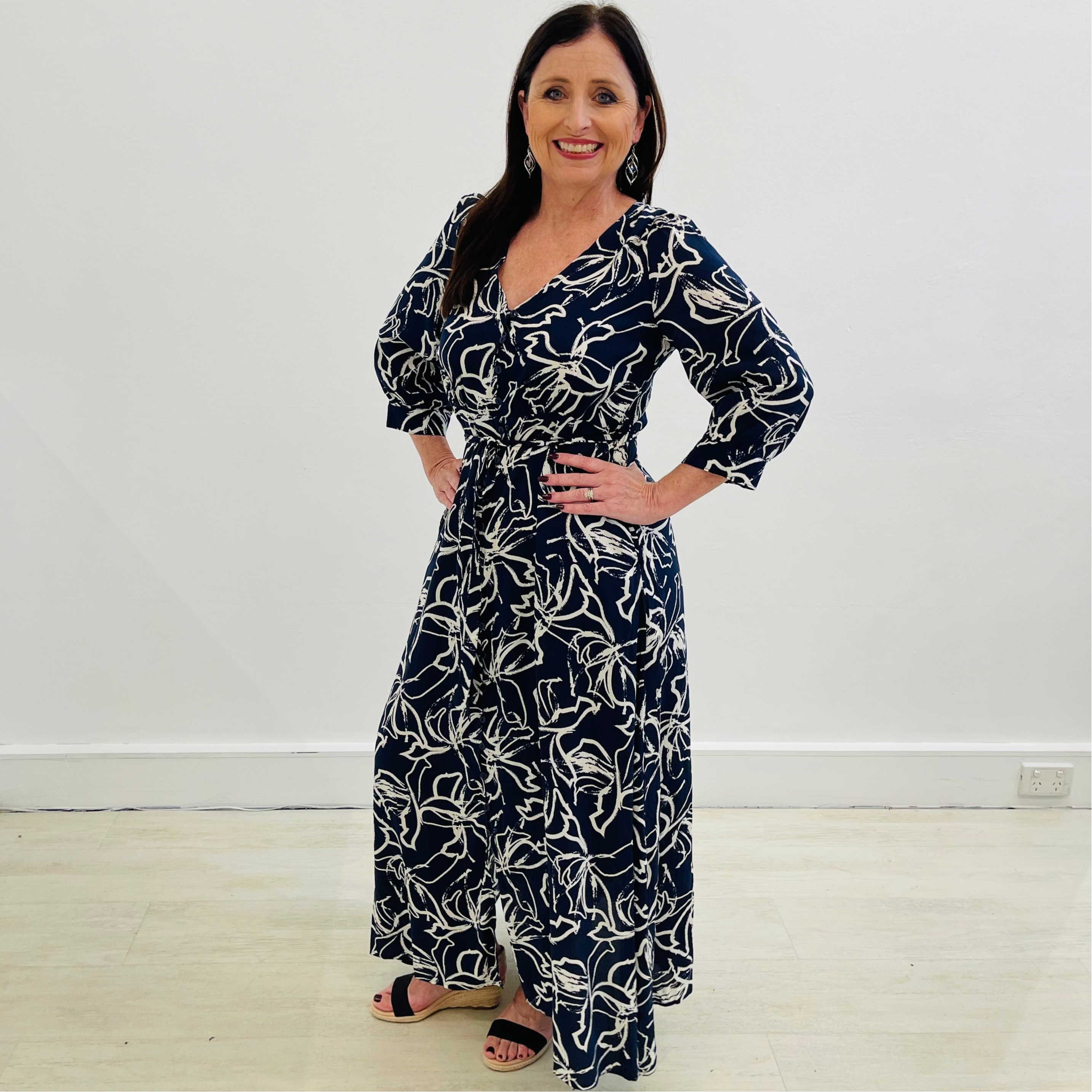Complete with a beautiful botanical-inspired pattern and cuffed mid-forearm sleeves, this dress transitions seamlessly from day to night.