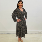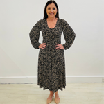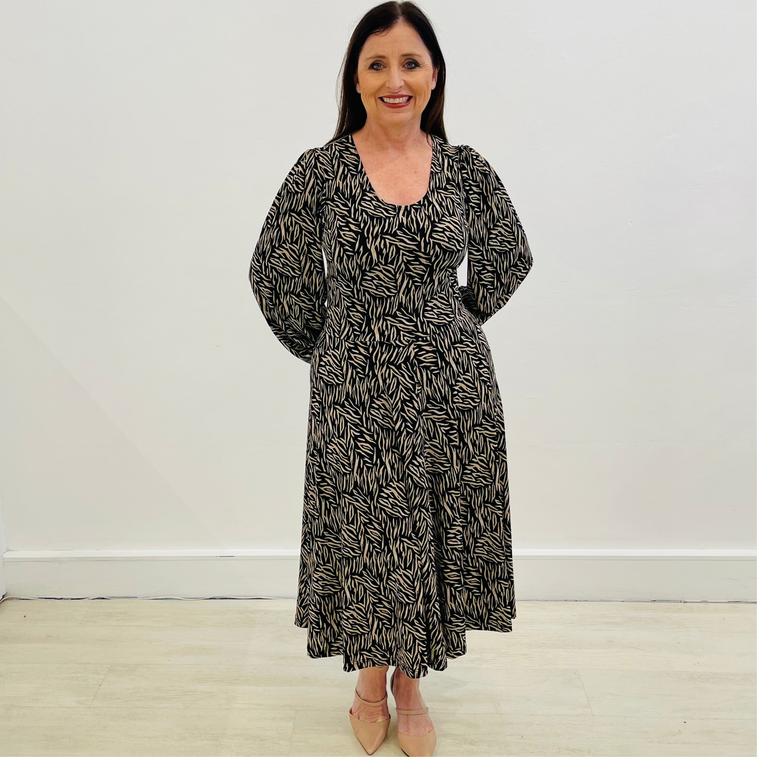Introducing our elegant Vine Whispers Dress, blending chic black, beige, and cream prints for a timeless appeal.