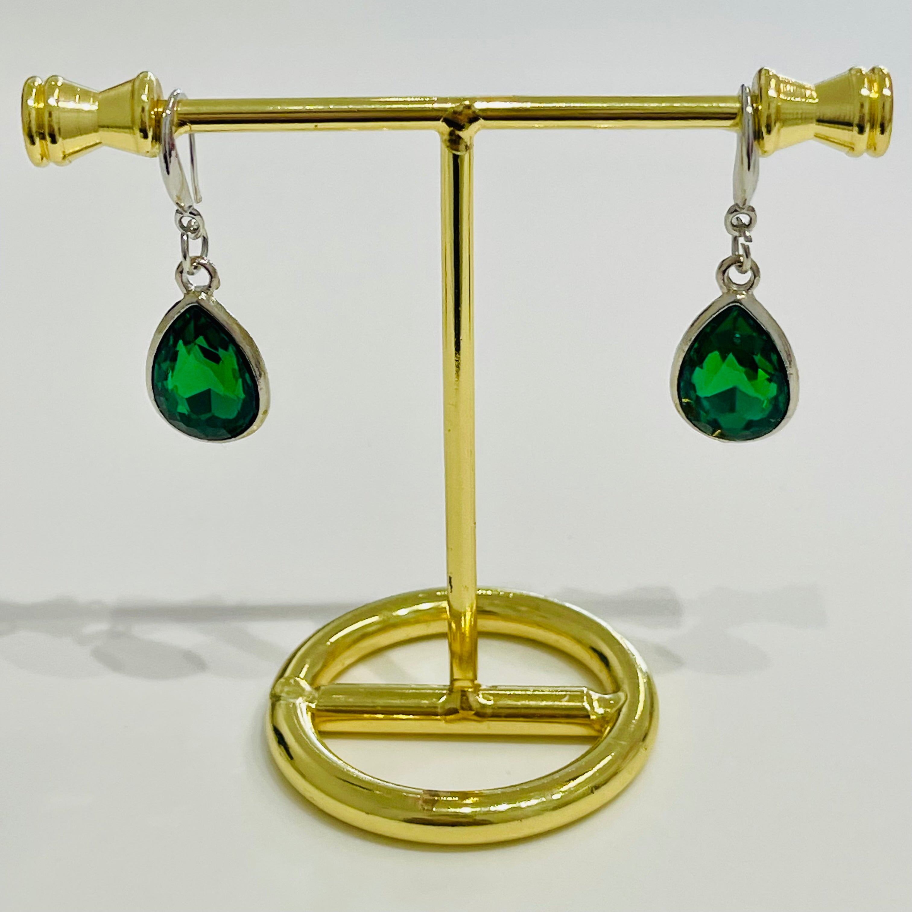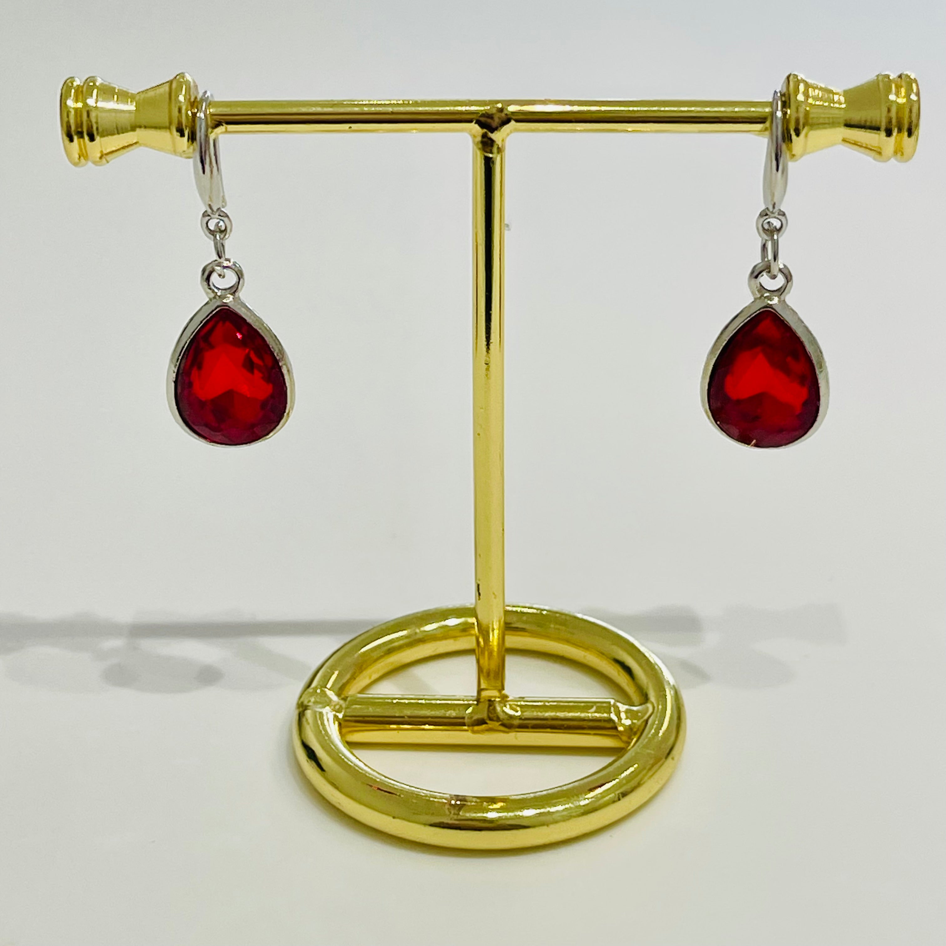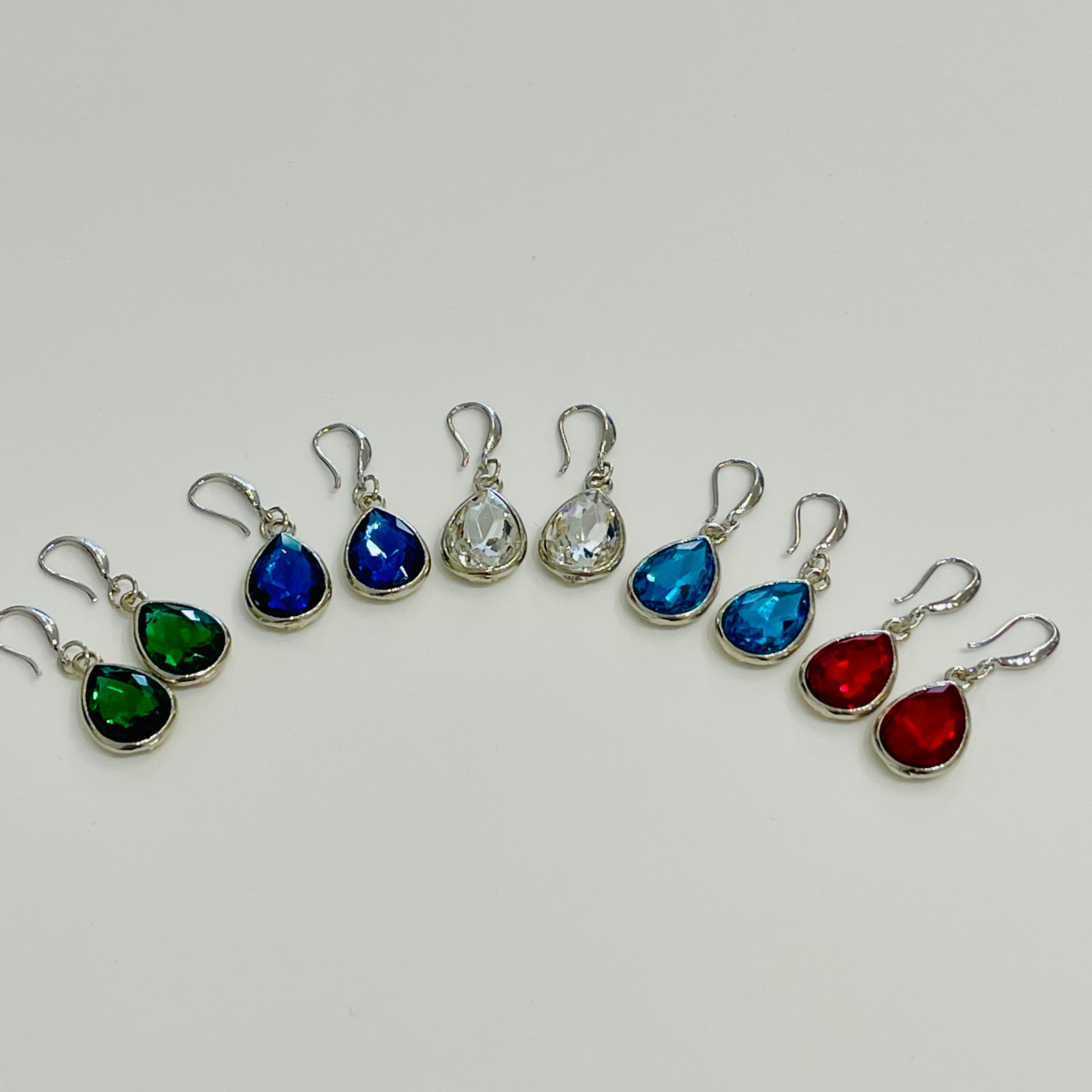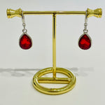 Red, green, blue, and clear crystal pendant drop earrings.