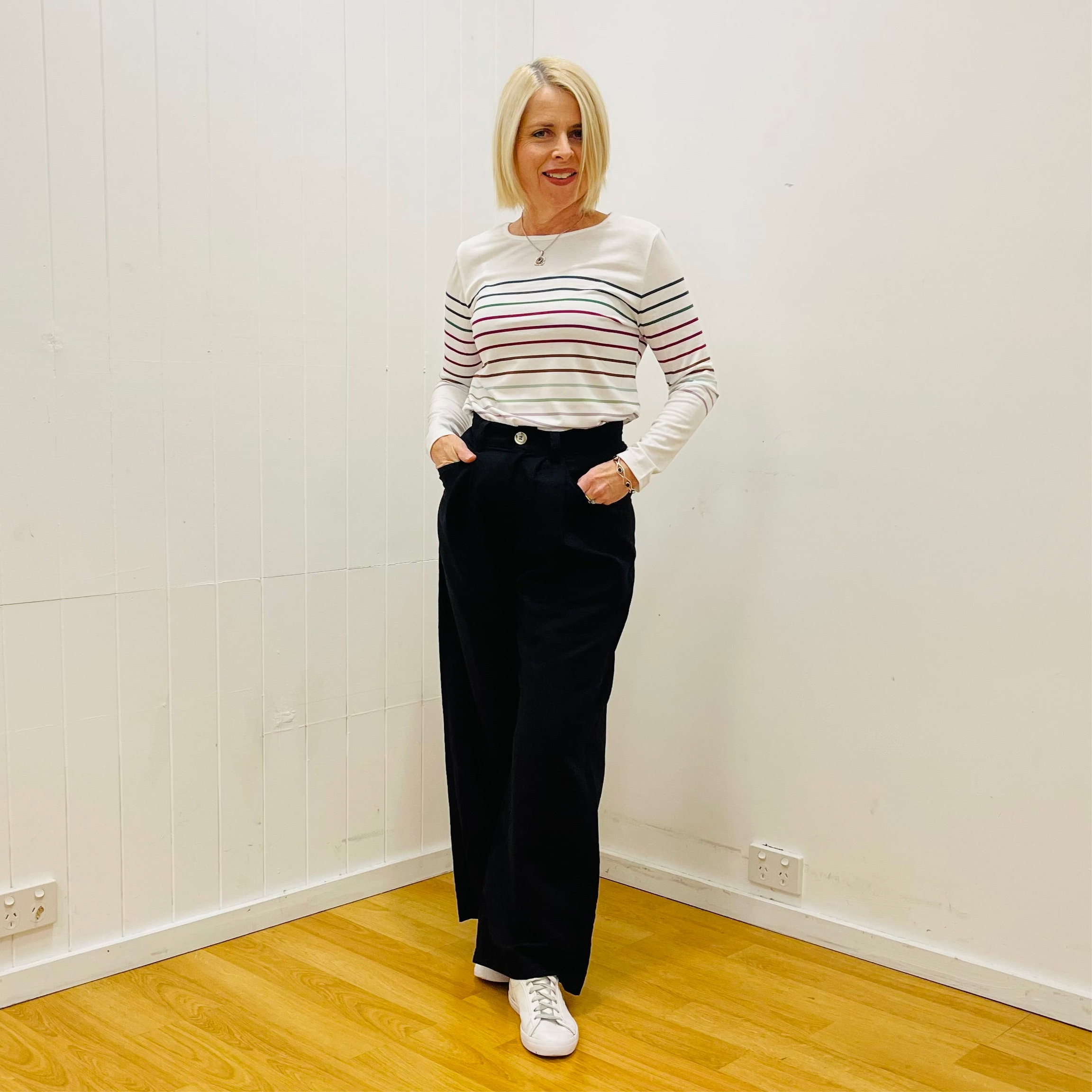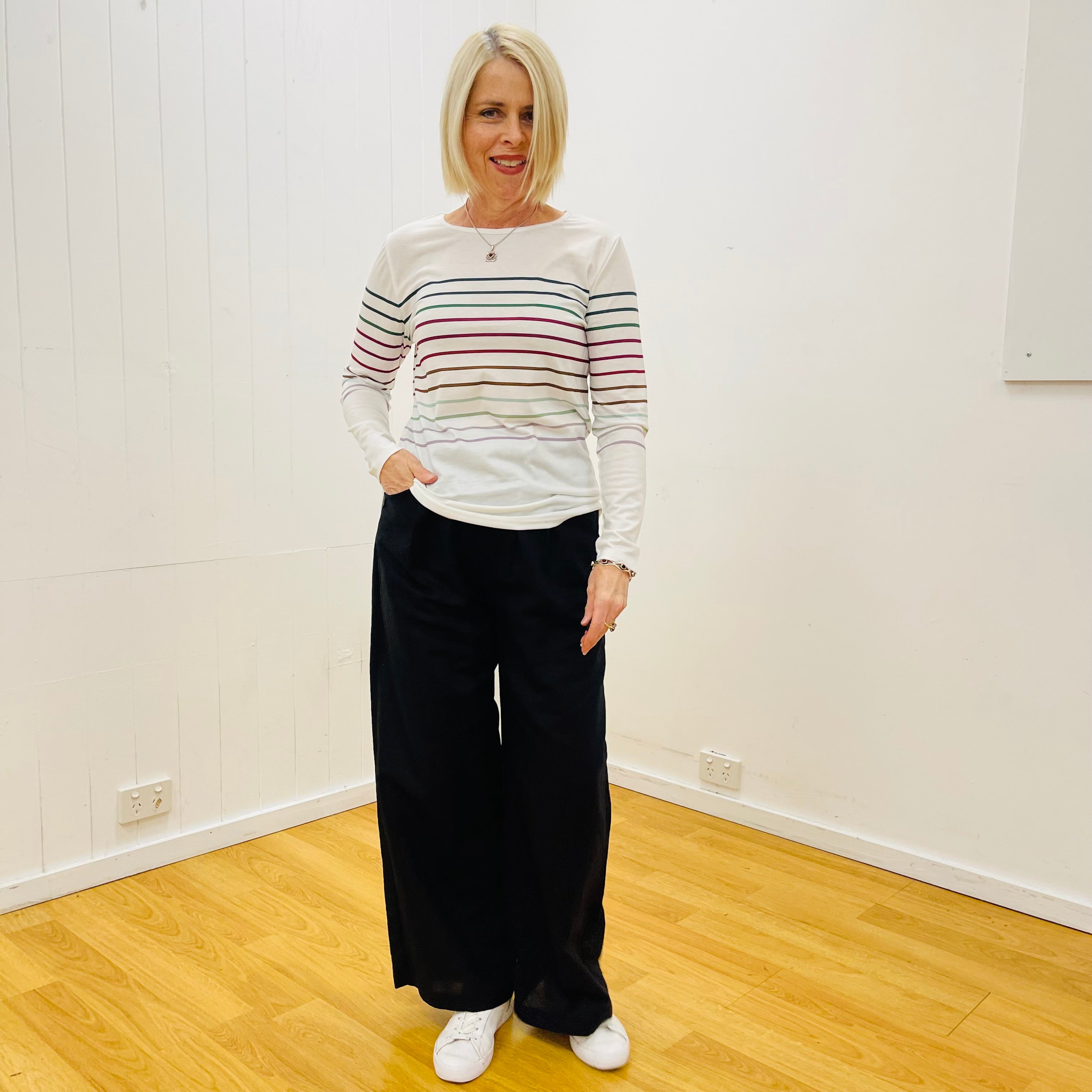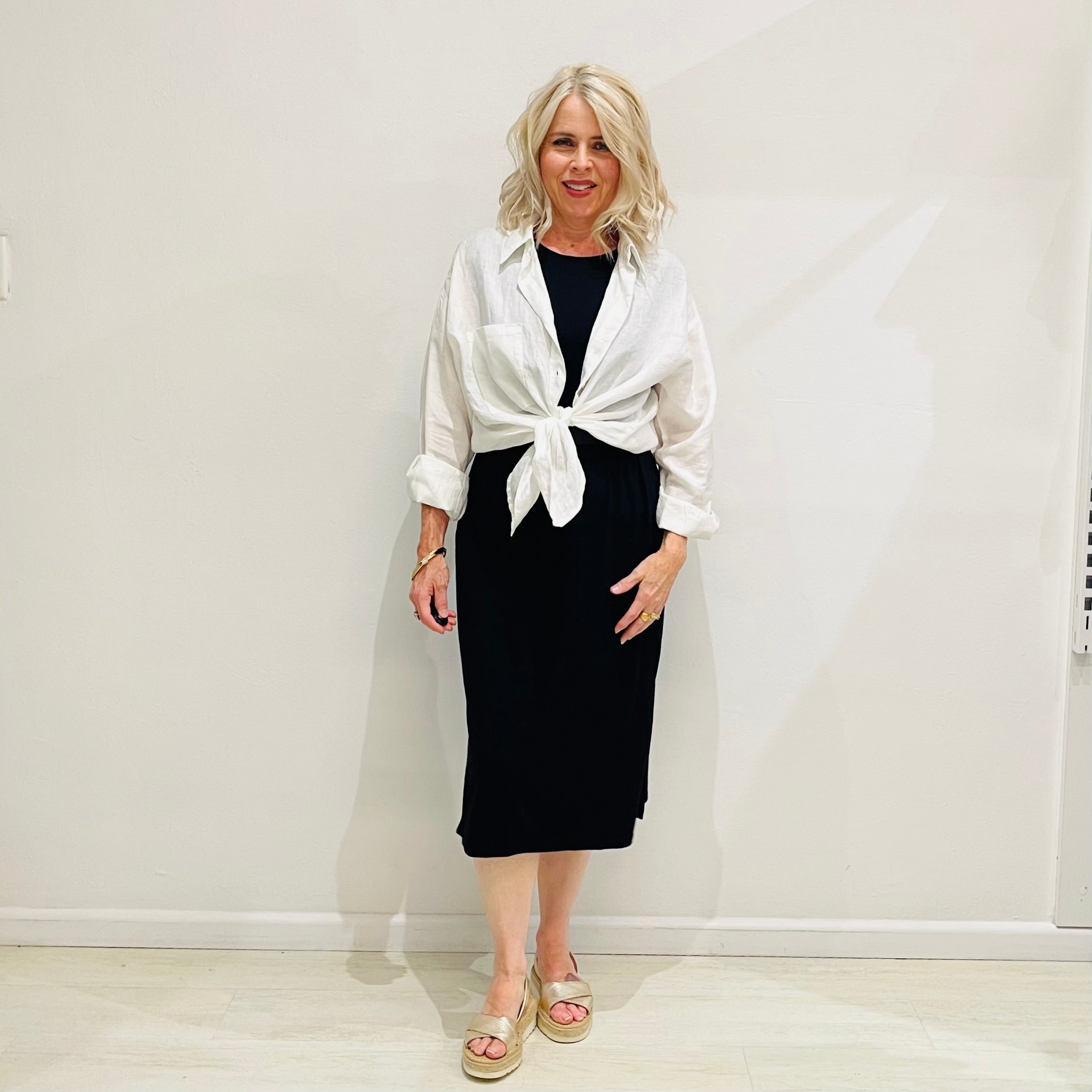 Relaxed fit, black bamboo, v neckline, long sleeve, tie front detail, dressy top. Worn with midi length skirt with slight hemline ruffle in black,white and pink.
