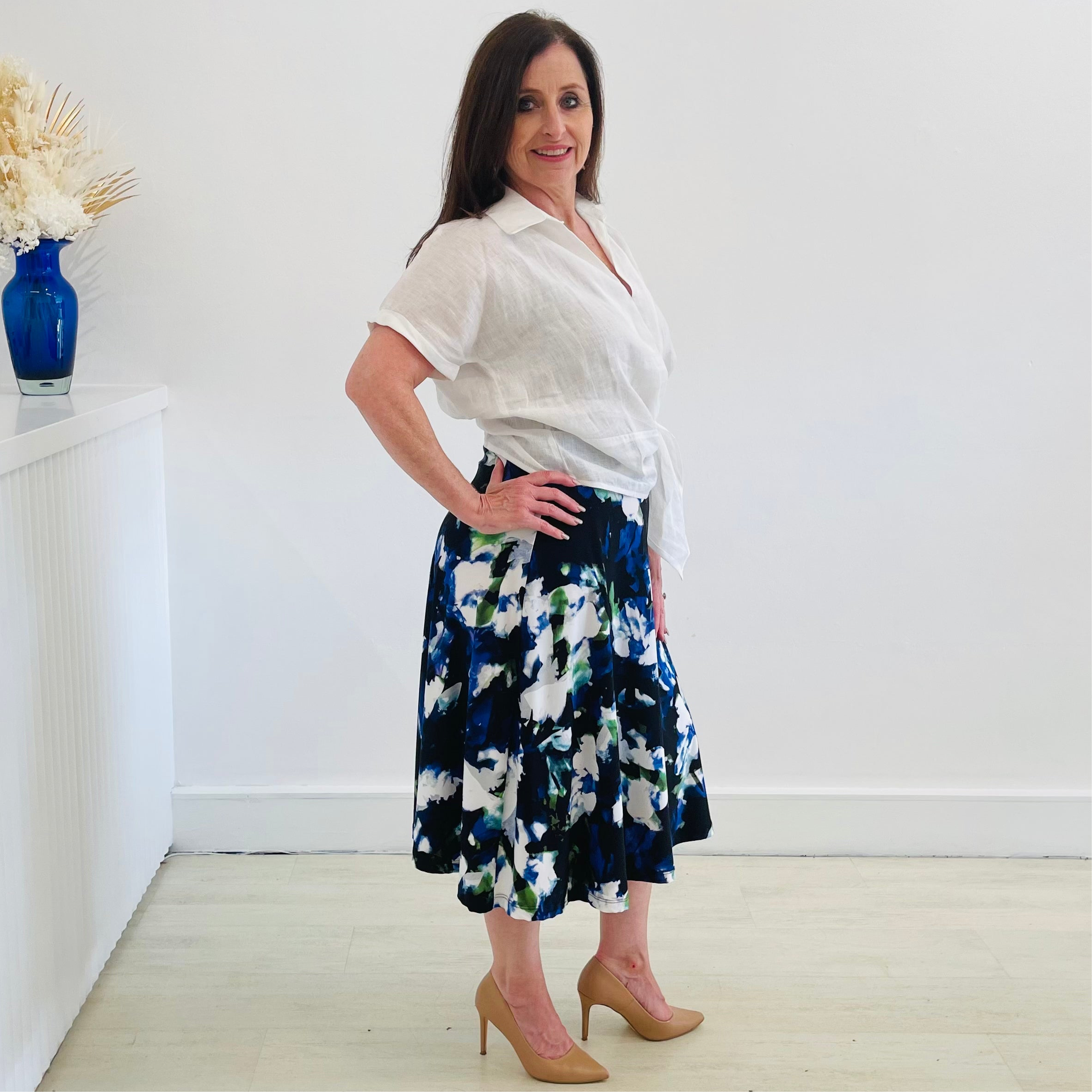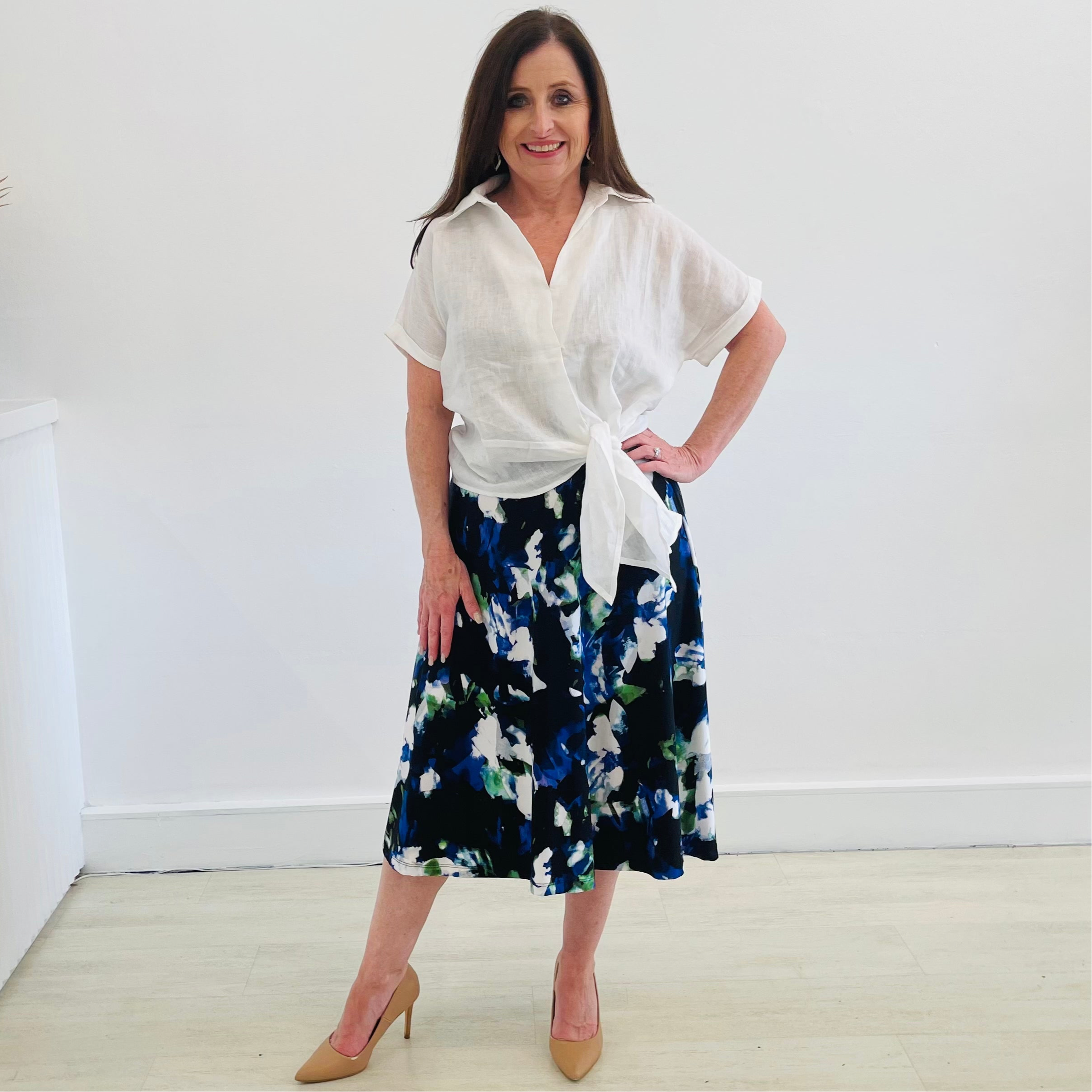 Relaxed fit, cobalt blue bamboo, v neckline, long sleeve, tie front detail, dressy top. Worn with midi length skirt with blue, black, white pattern print.