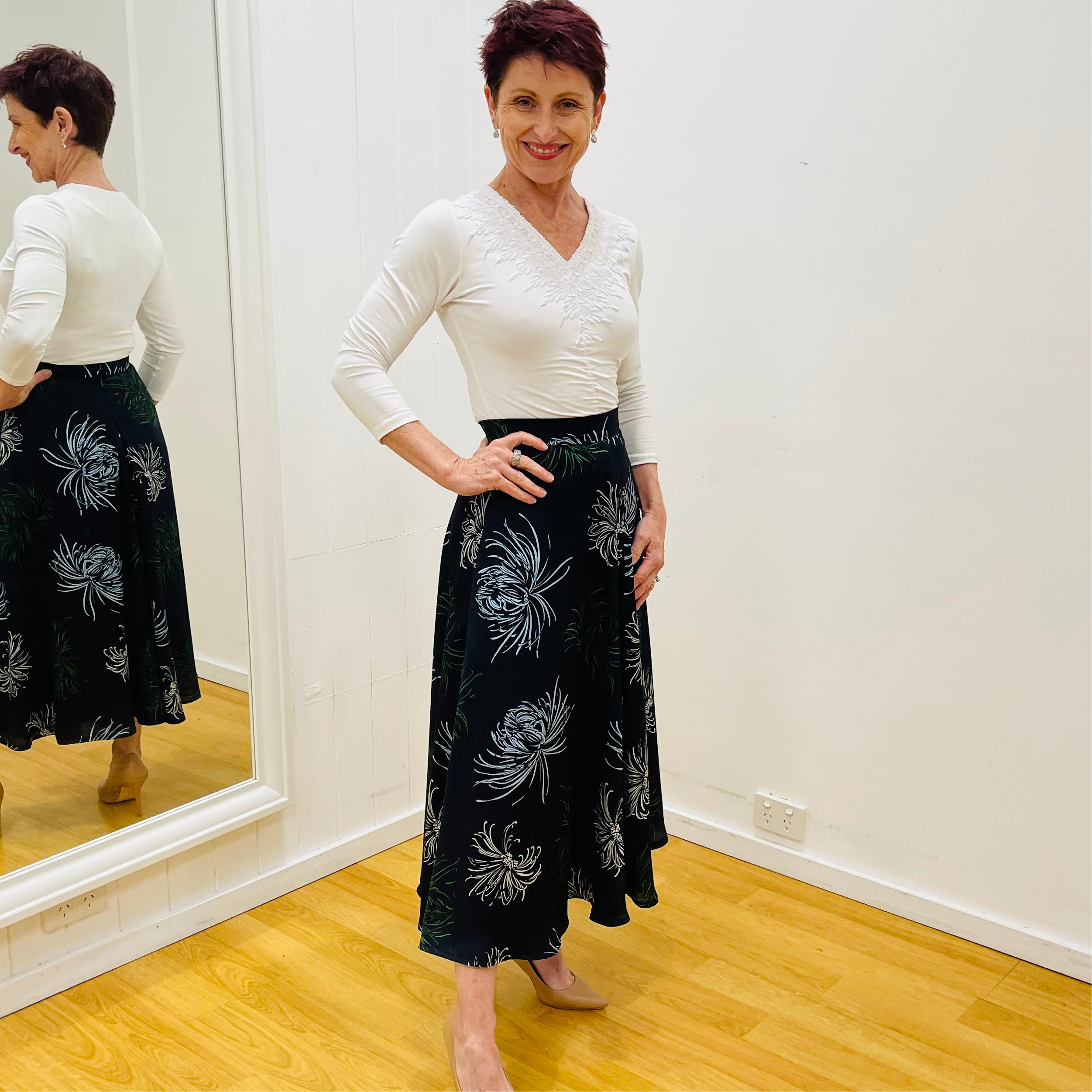 We've paired this stunning Navy Floral Flared Skirt with our timeless White Bamboo Blend Ruched Front Top with White Lace detail a classic piece infused with a modern touch through its elegant white lace detailing