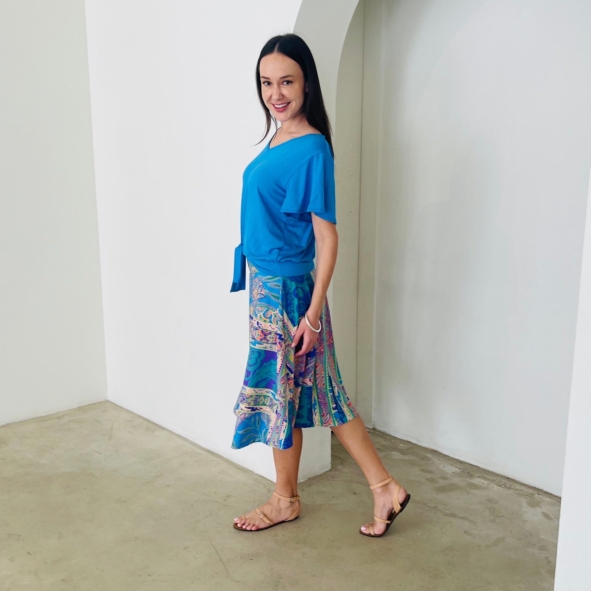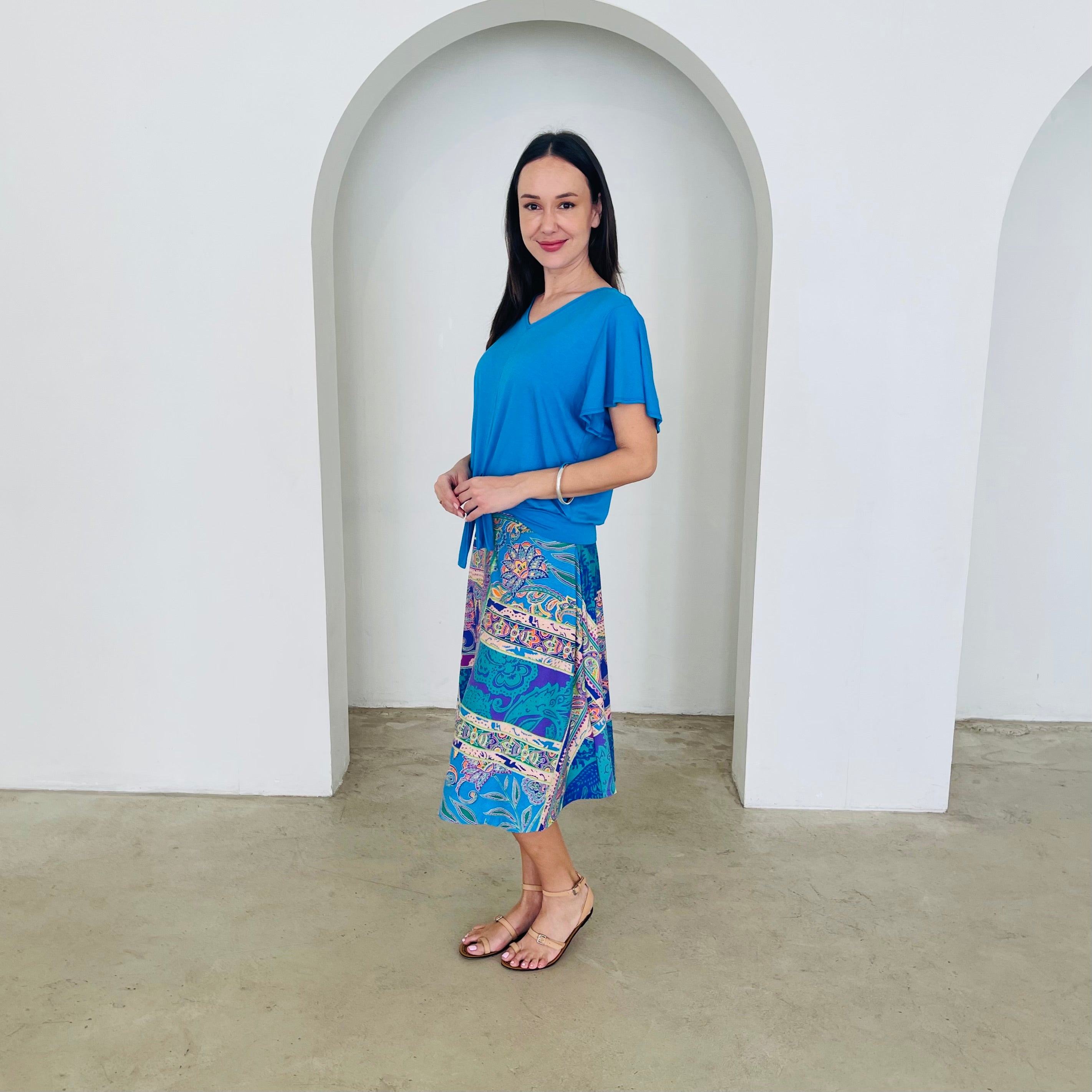 Woman wearing a blue top and colorful patterned skirt standing in front of a white wall with an arch.