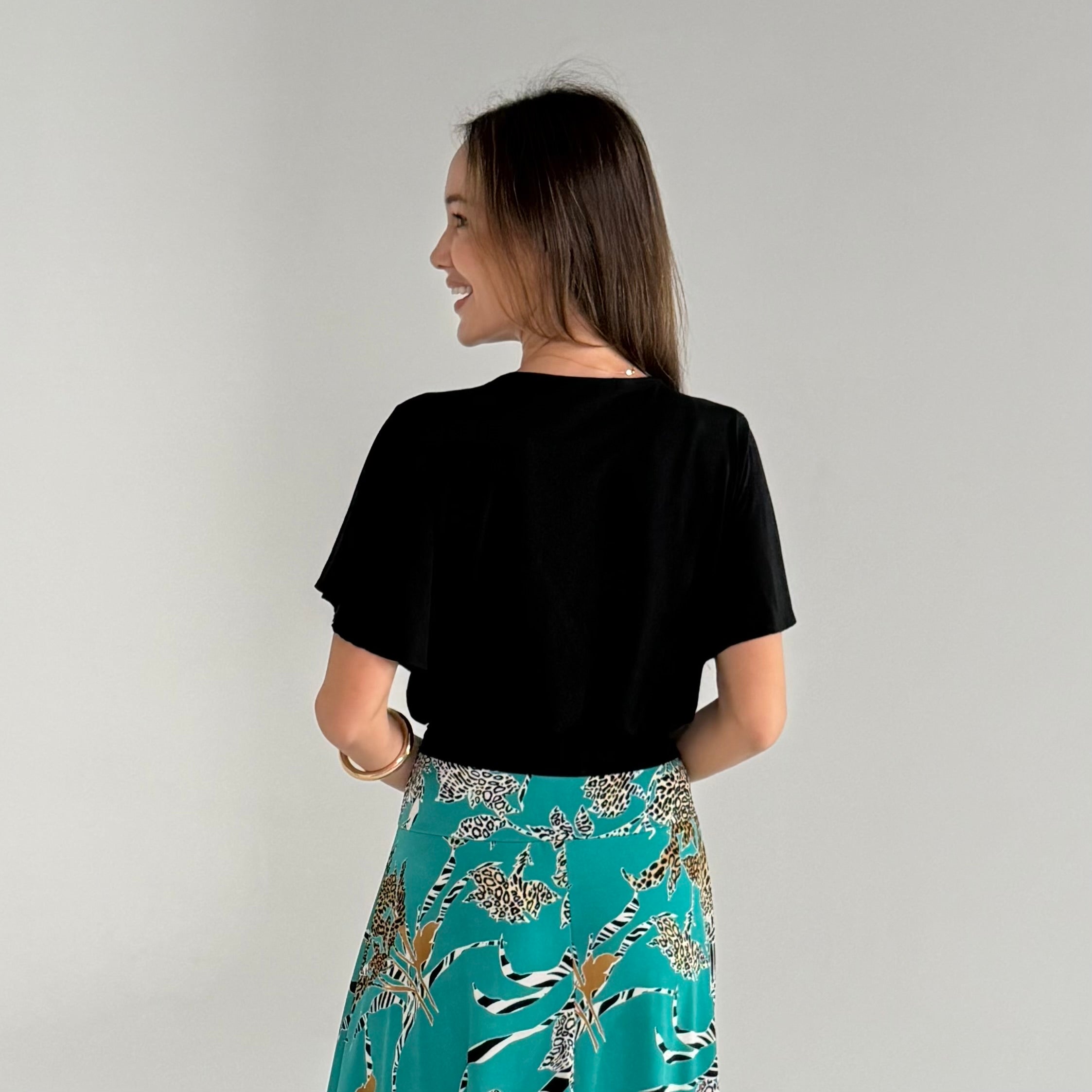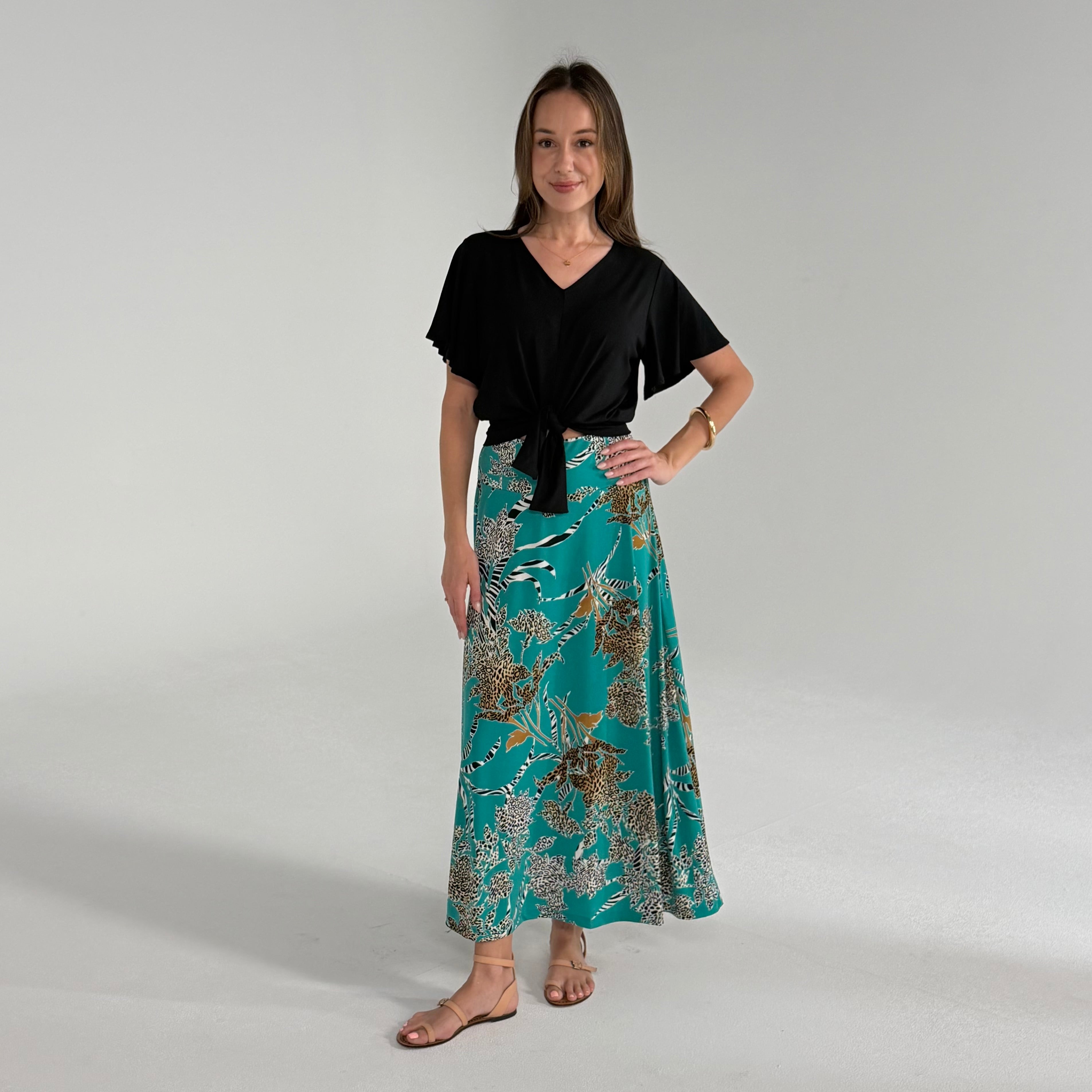 Woman wearing a black top and a teal patterned skirt against a plain background