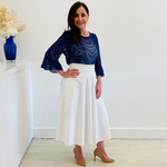 The White Fully Lined Flared Skirt has a fitted waistband and a centre back invisible zipper. It has four gored panels which creates the gorgeous flare. This beauty is lined with satin and has the convenience and versatility of pockets. It is THE go-to skirt for all your special occasions.