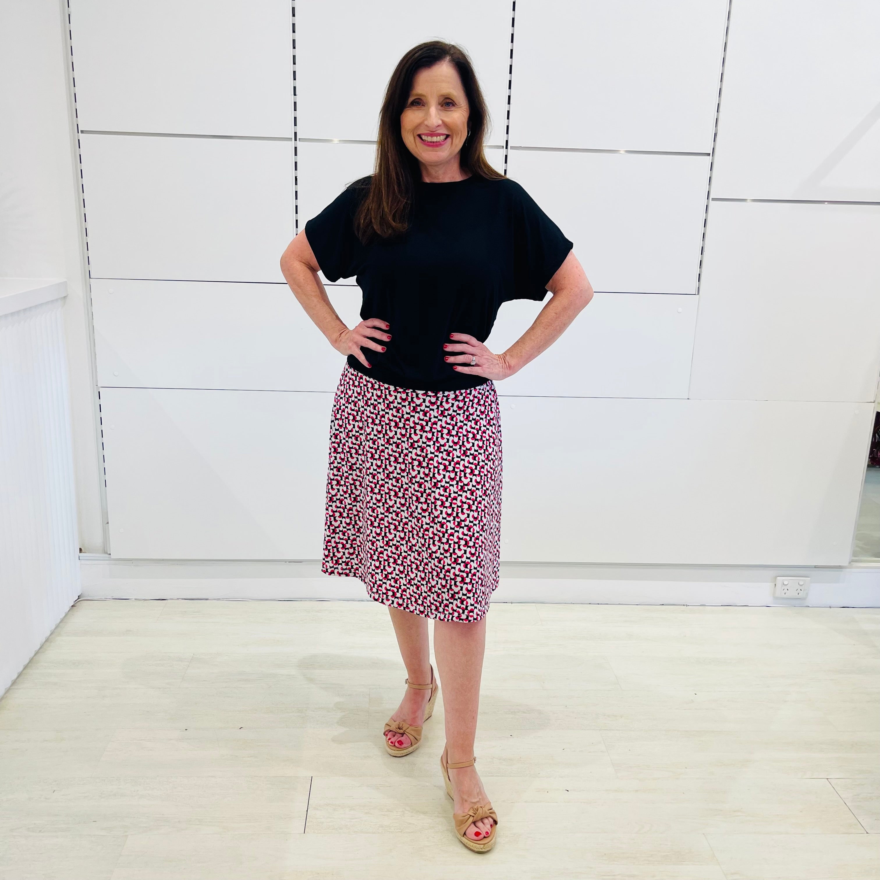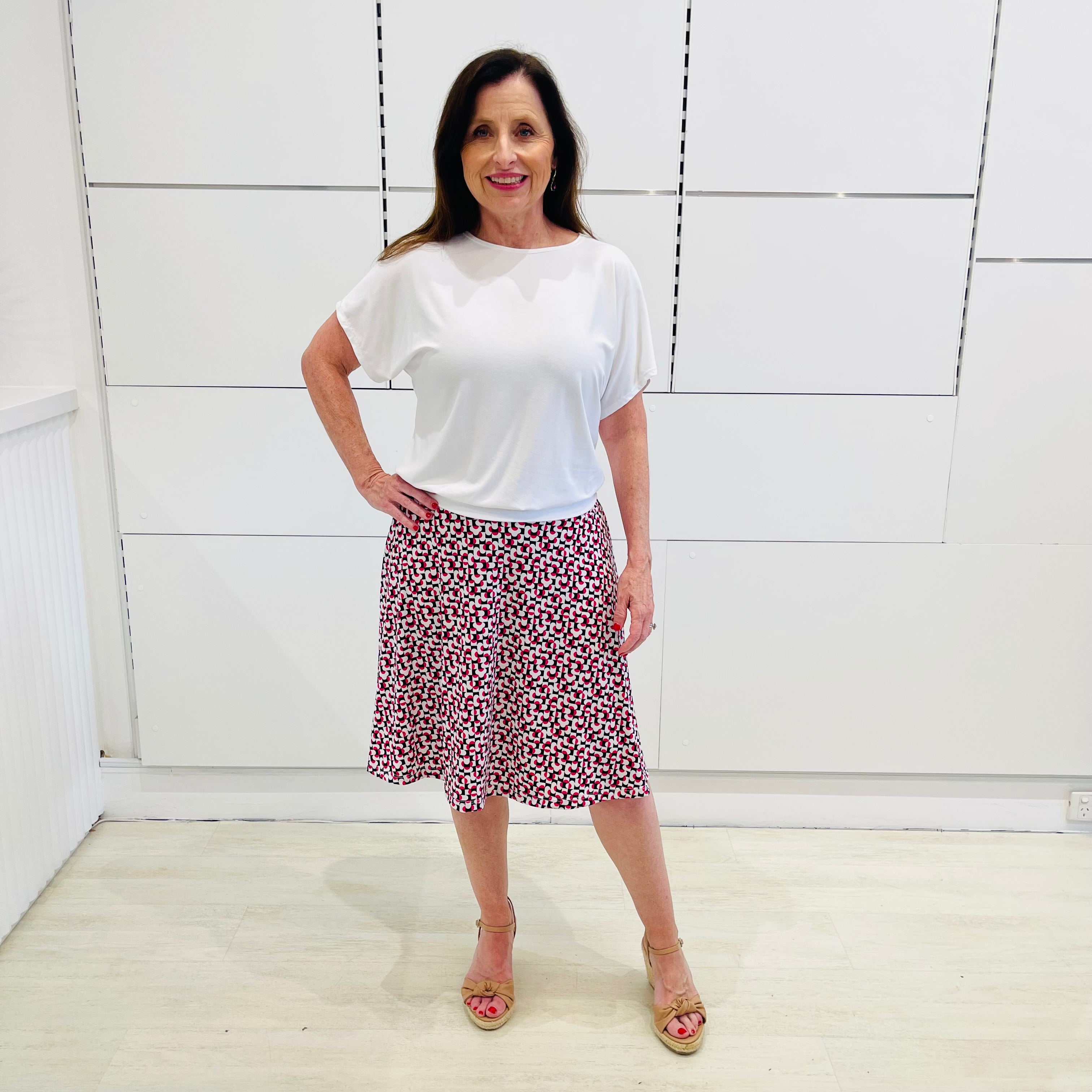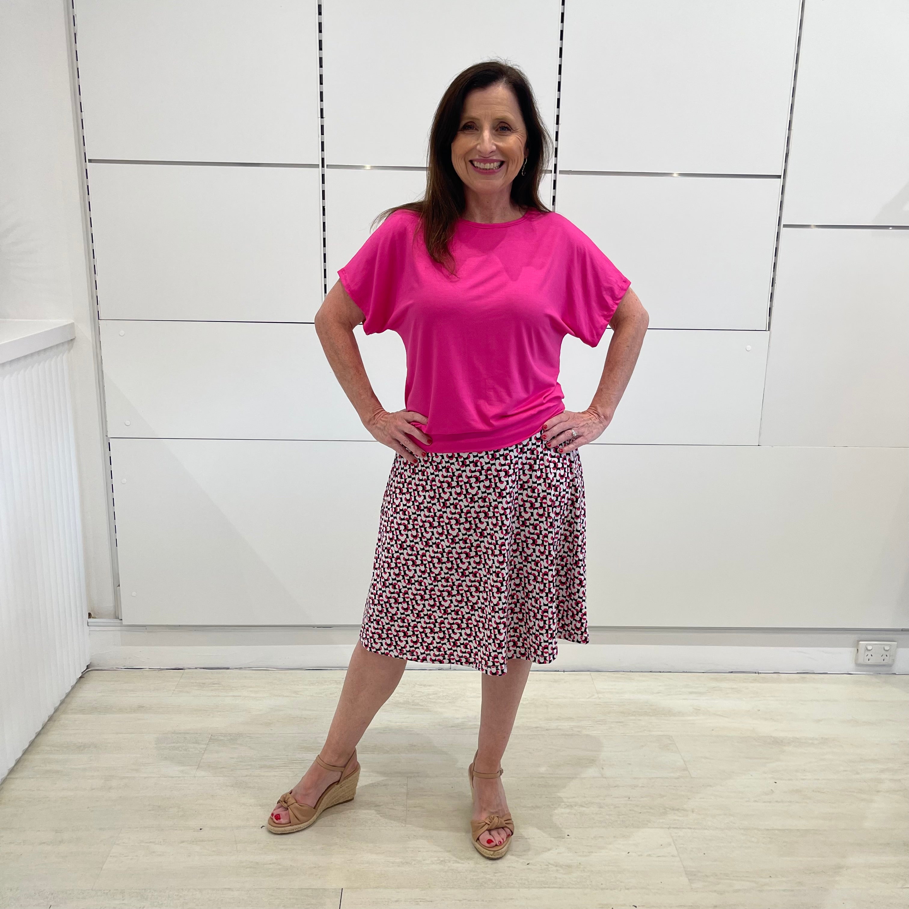 Add a pop of playful  fun to your wardrobe with the Ella Skirt in our vibrant Geo Pink print.