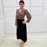 Midi length,  handkerchief, dipped hemline, stretch waistband, jersey skirt. Multicolored , long sleeve, round scoop neckline, fitted women's top, stretch jersey fabric.