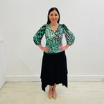Midi length, dipped hemline, stretch waistband, jersey skirt. Green, black, white anilmal print , 3/4 sleeve, round scoop neckline, fitted women's top, stretch jersey fabric.