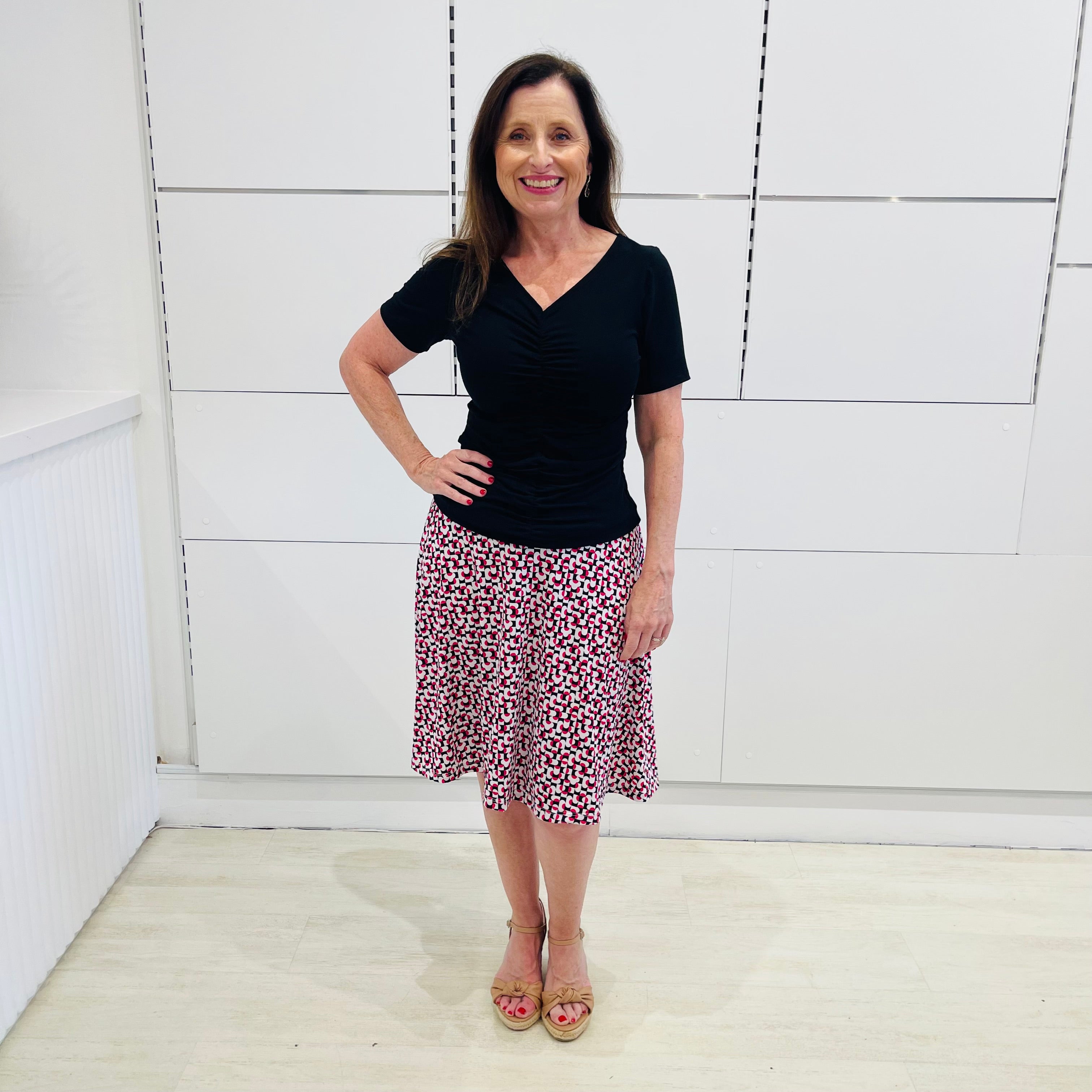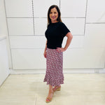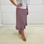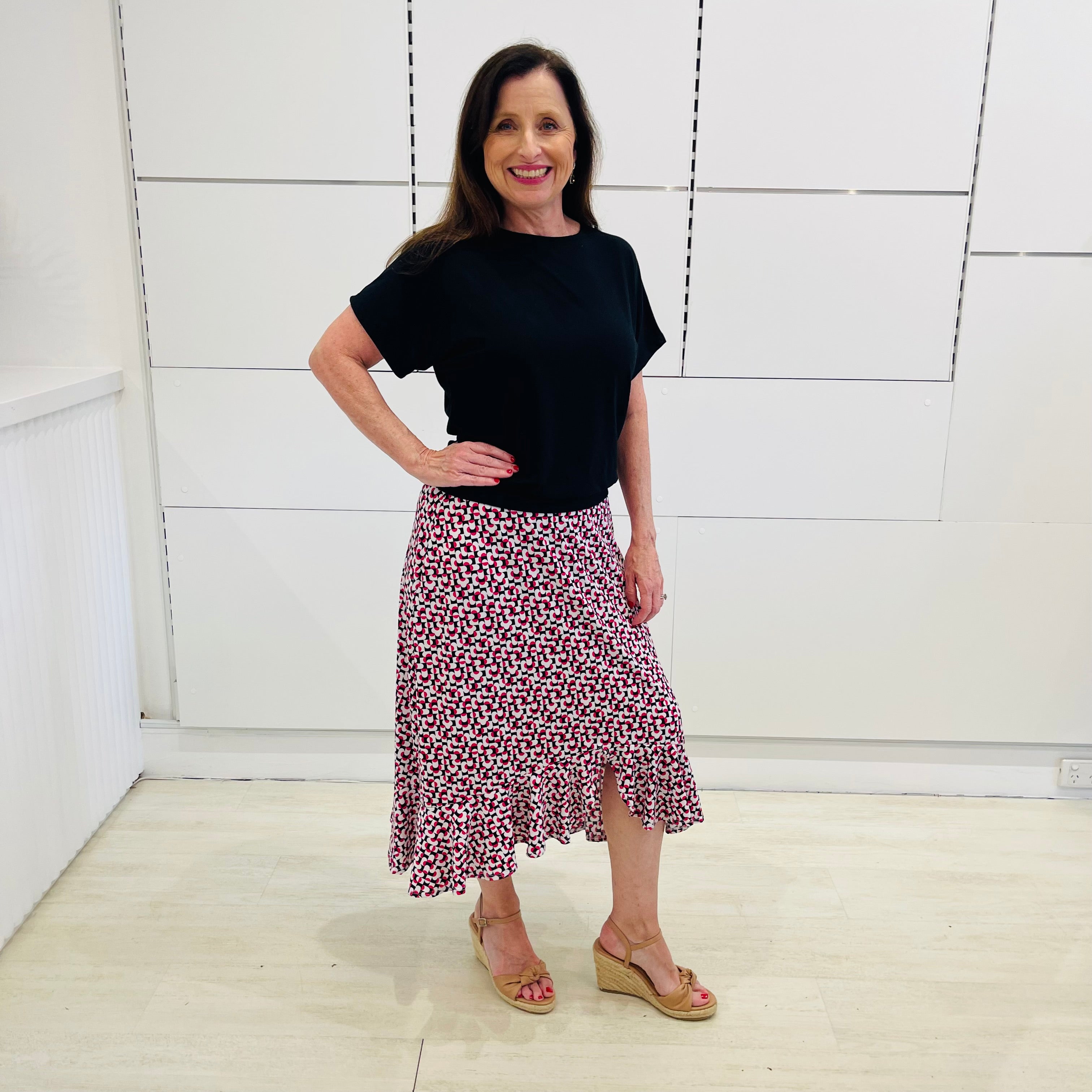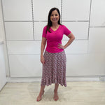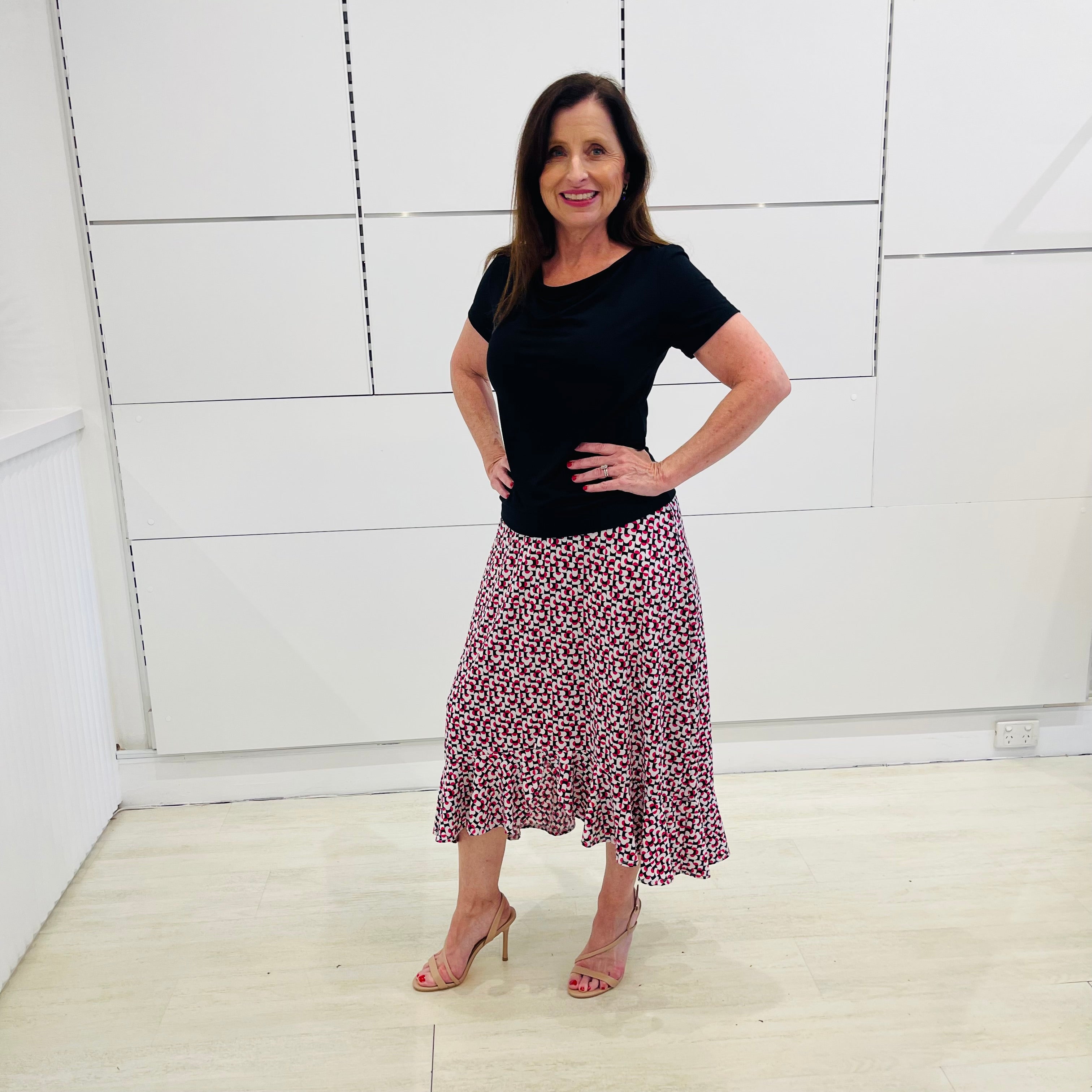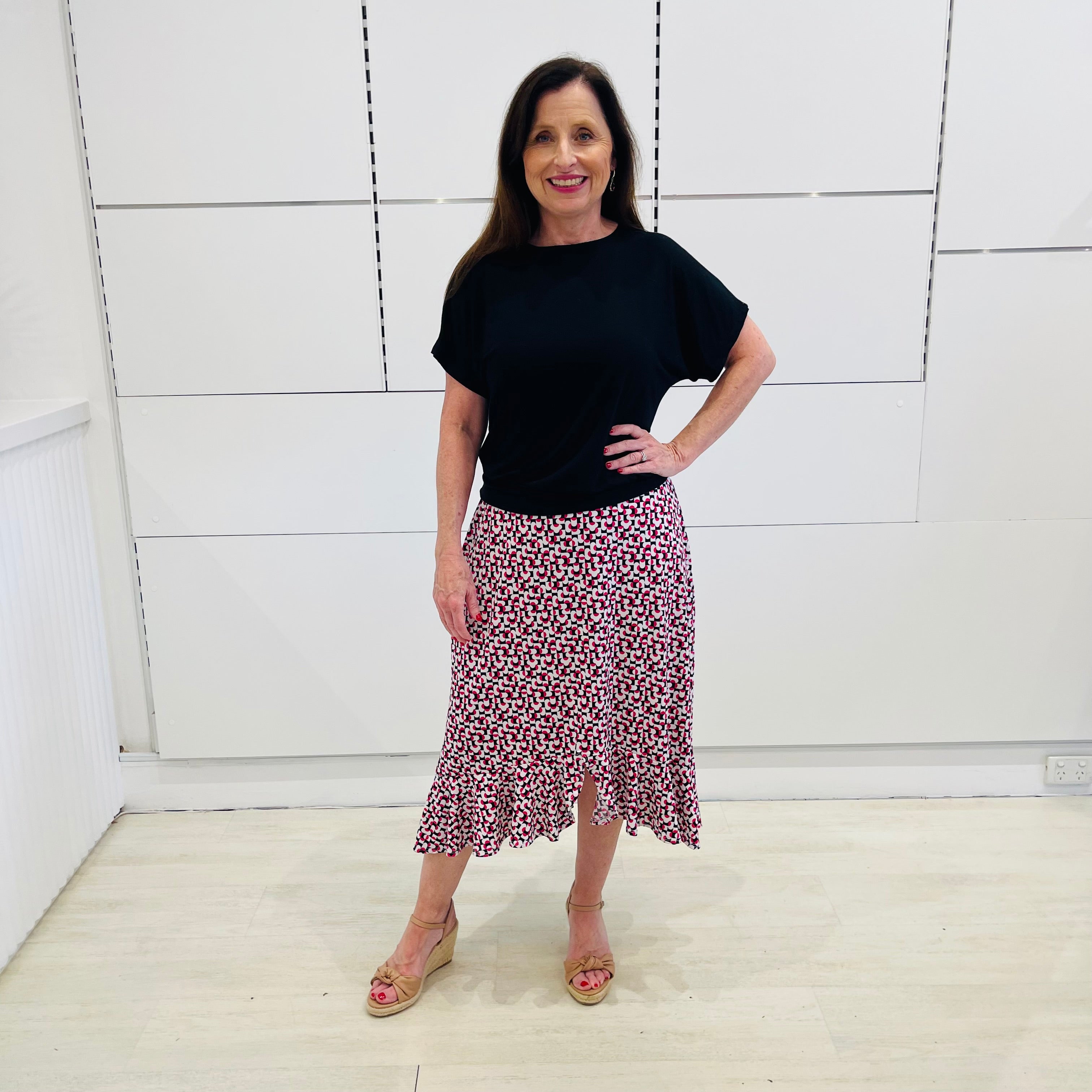 This elegant midi skirt features a delicate geo print, in pink, white and black, with a flattering asymmetrical hemline that moves beautifully with every step.