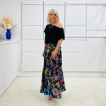 Relaxed fit, black ff the shoulder top with waist shape band.
