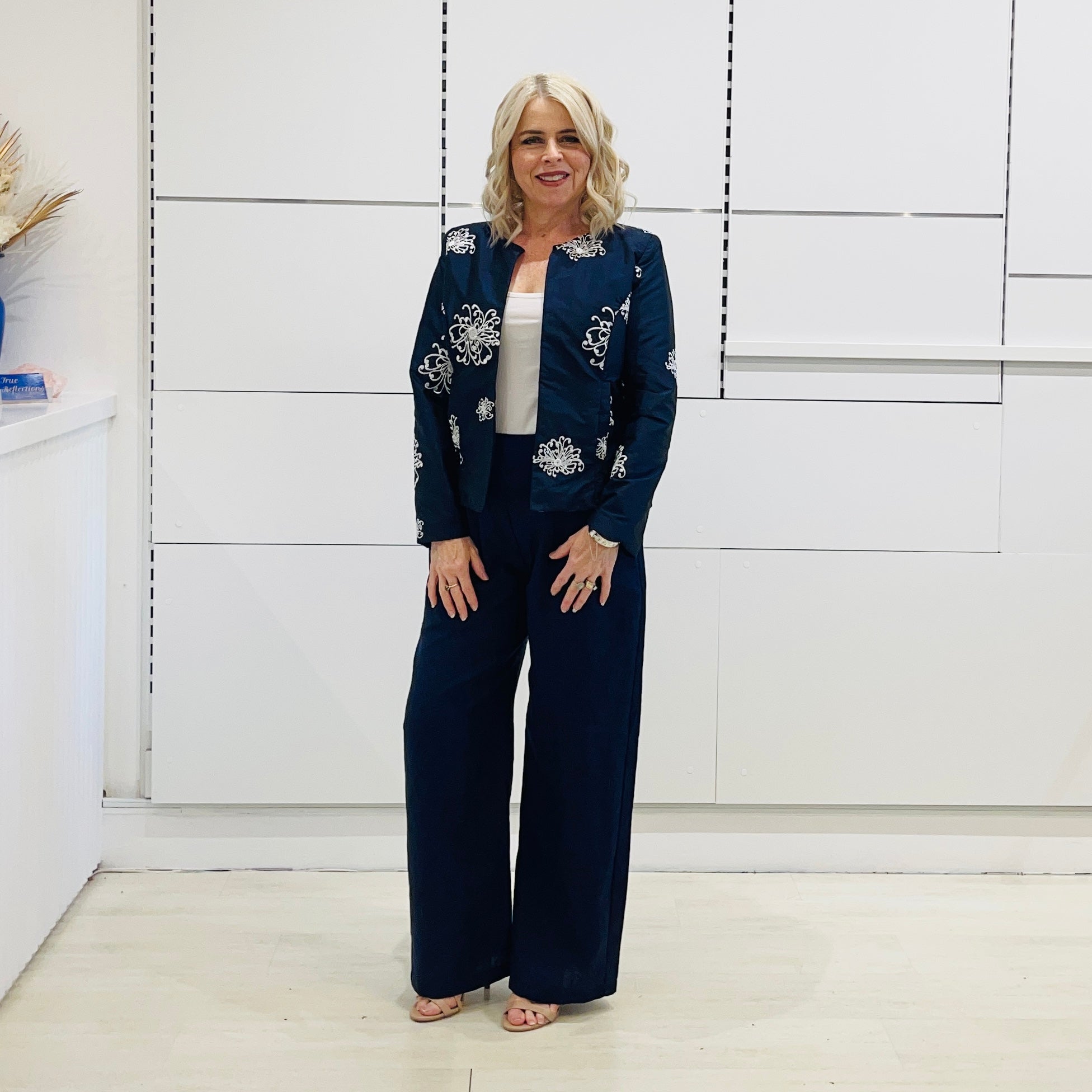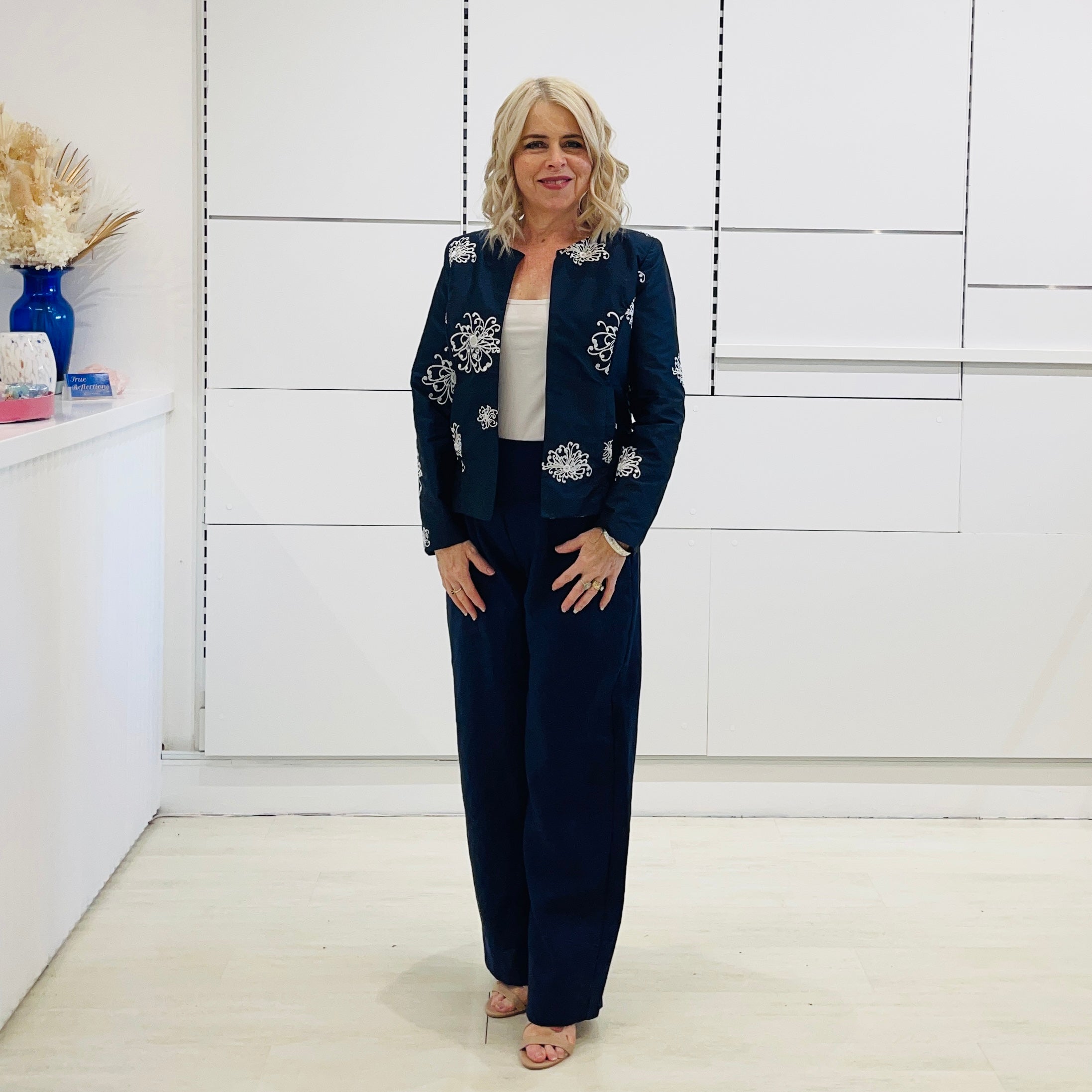 Delicate white embroidery adorns the jacket, creating a striking contrast against the lustrous navy fabric. The intricate detailing adds a touch of artistry, making this a standout piece for any refined ensemble. The tailored fit and impeccable construction ensure both comfort and style, while the open-front design allows for versatile styling, and a flattering look