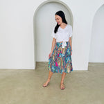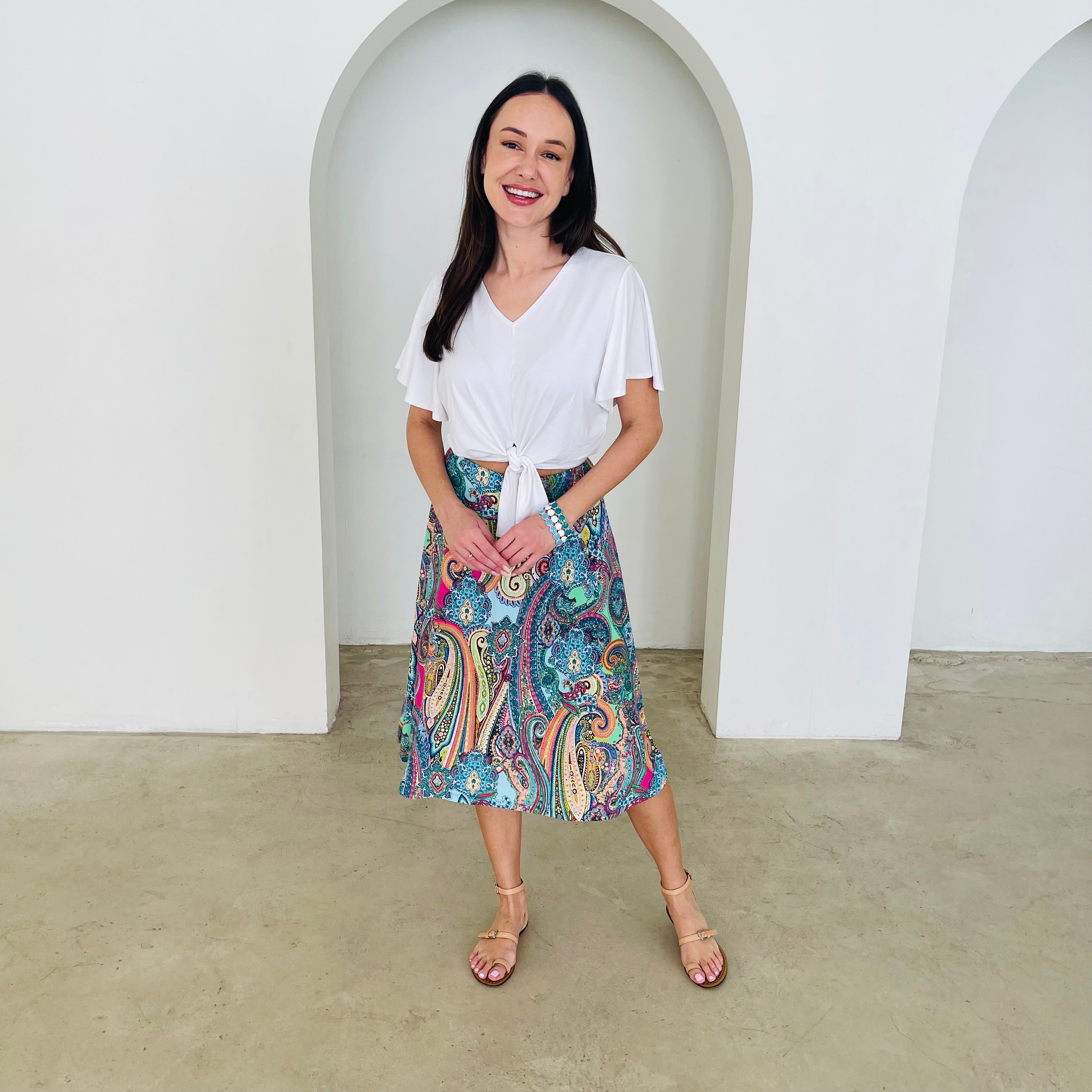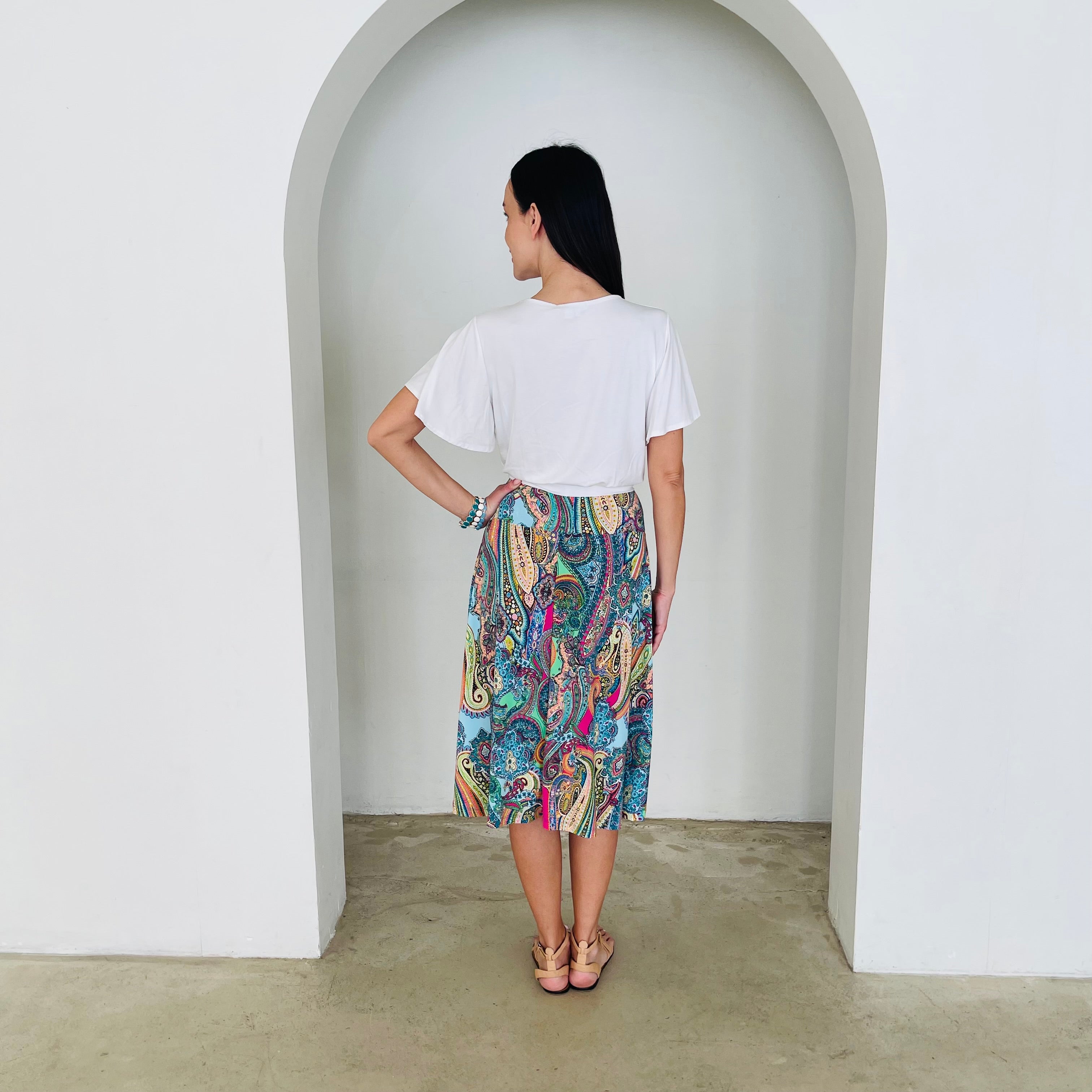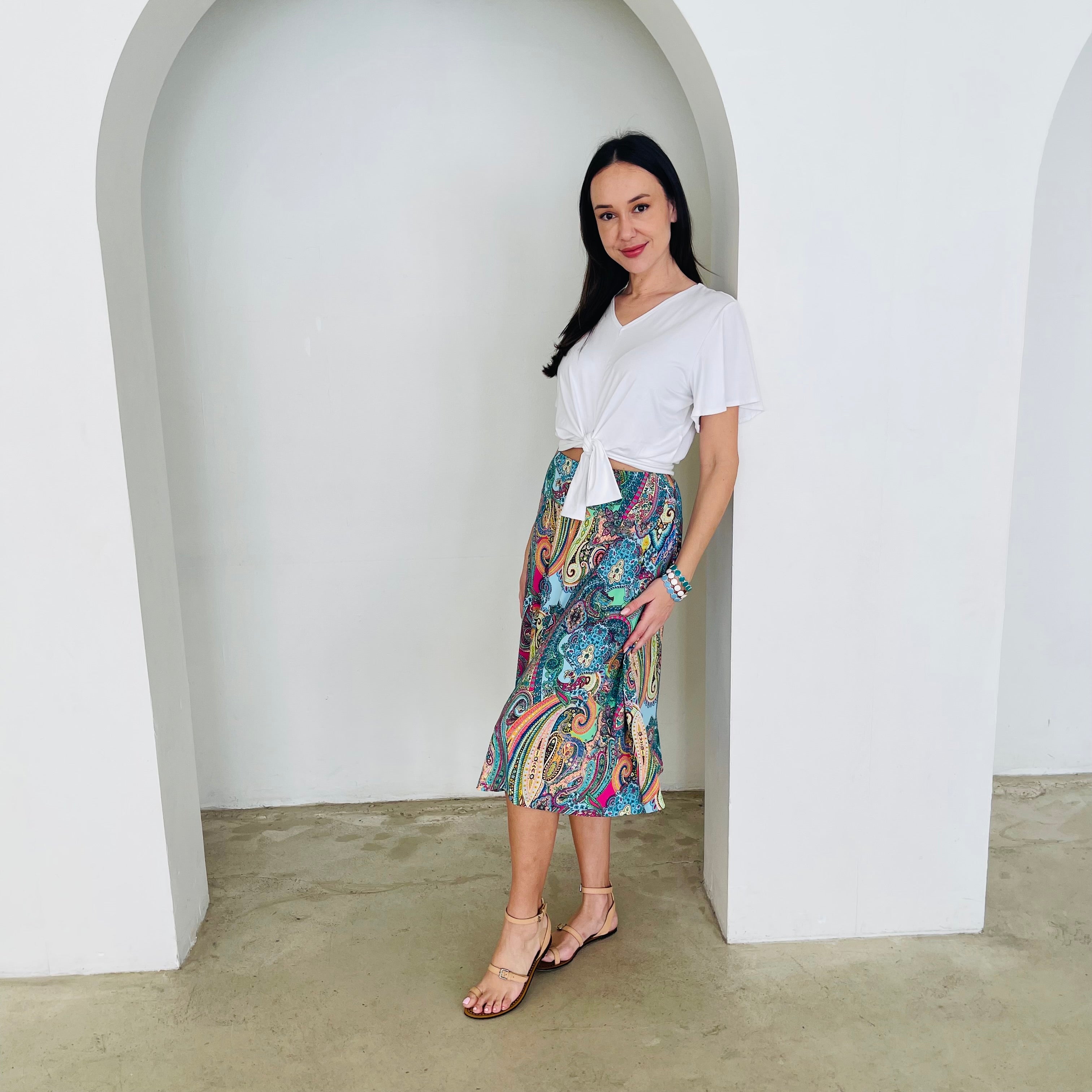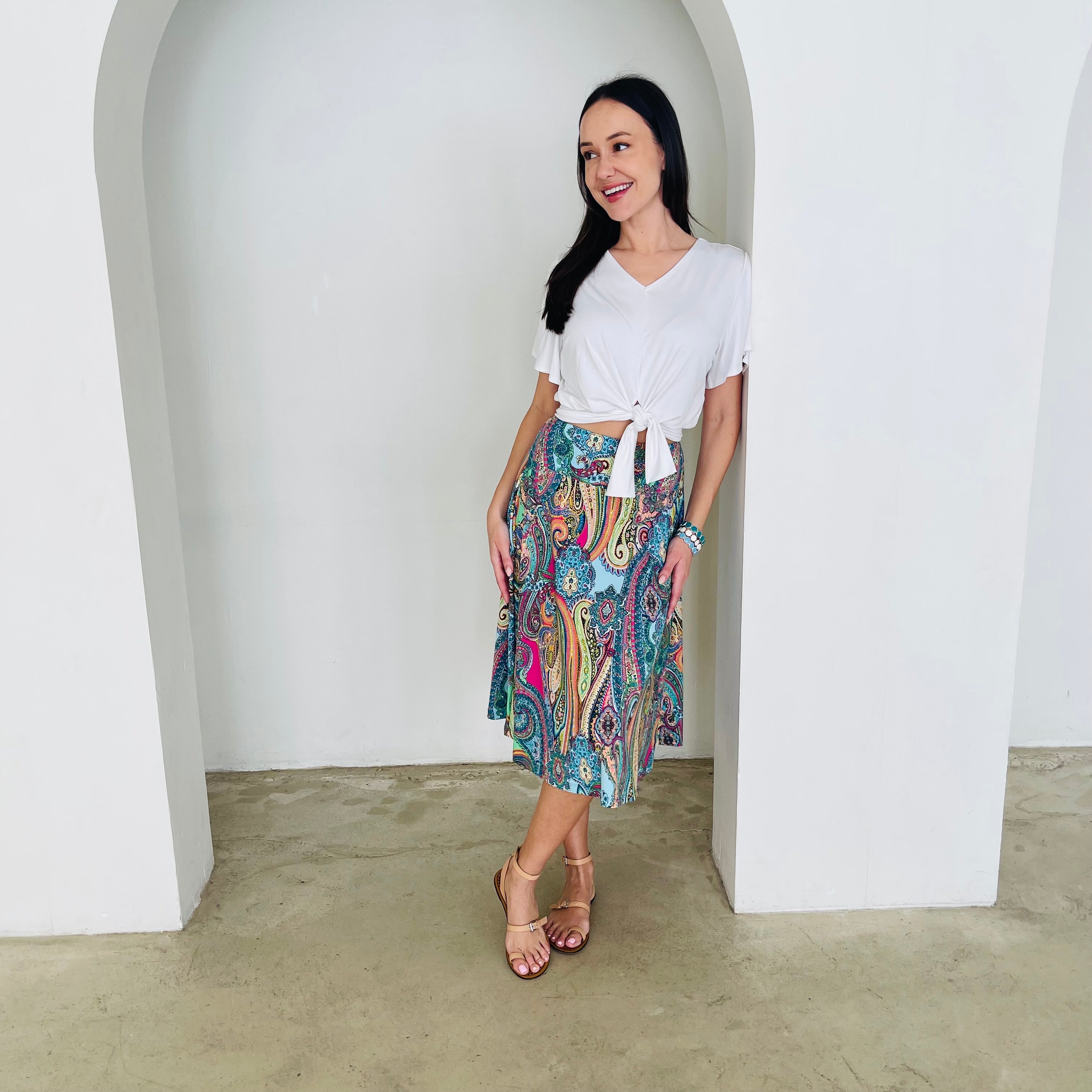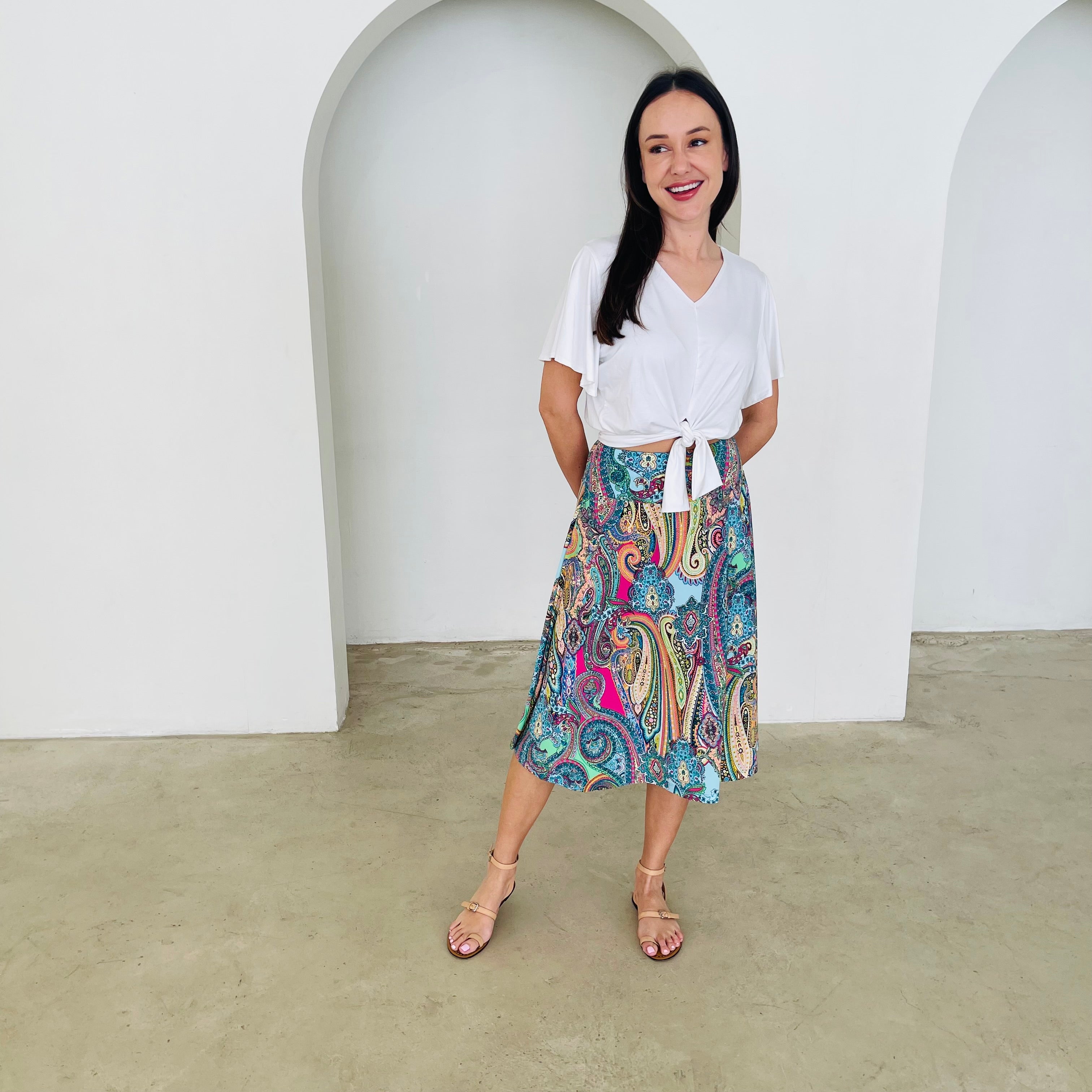 Step into joy with our Rainbow Rhapsody Midi Skirt — a playful swirl of bold paisley in every shade of the rainbow.