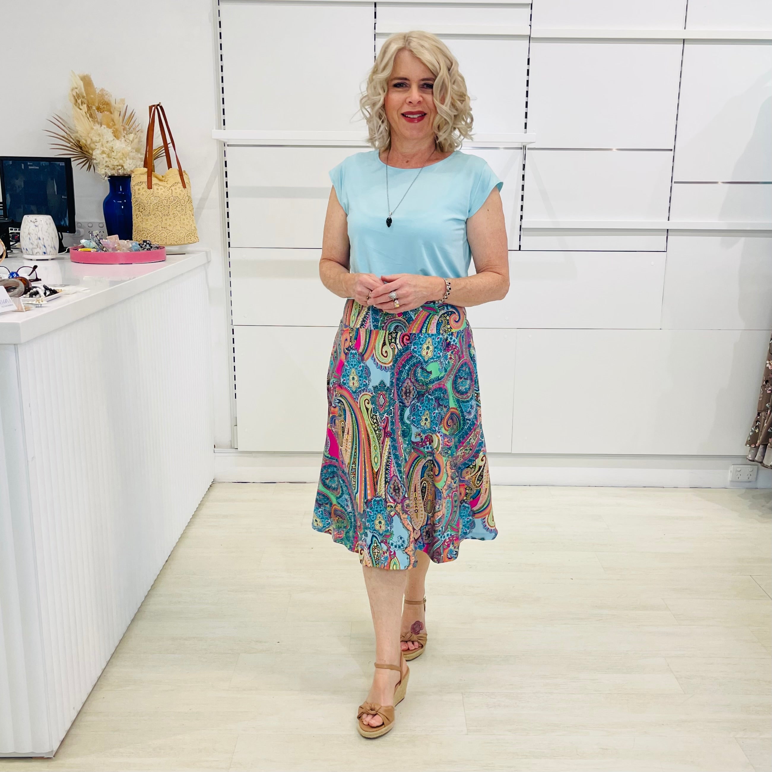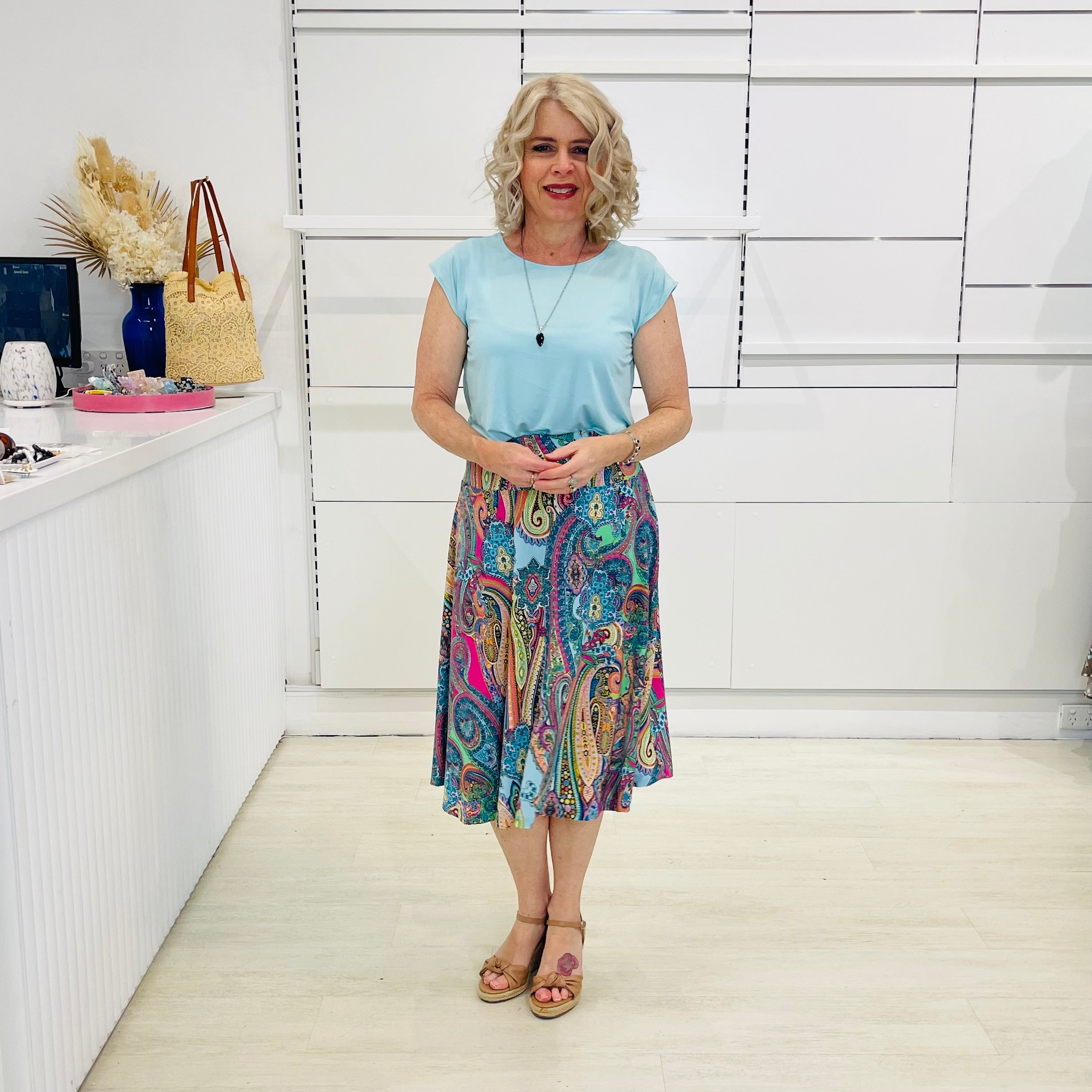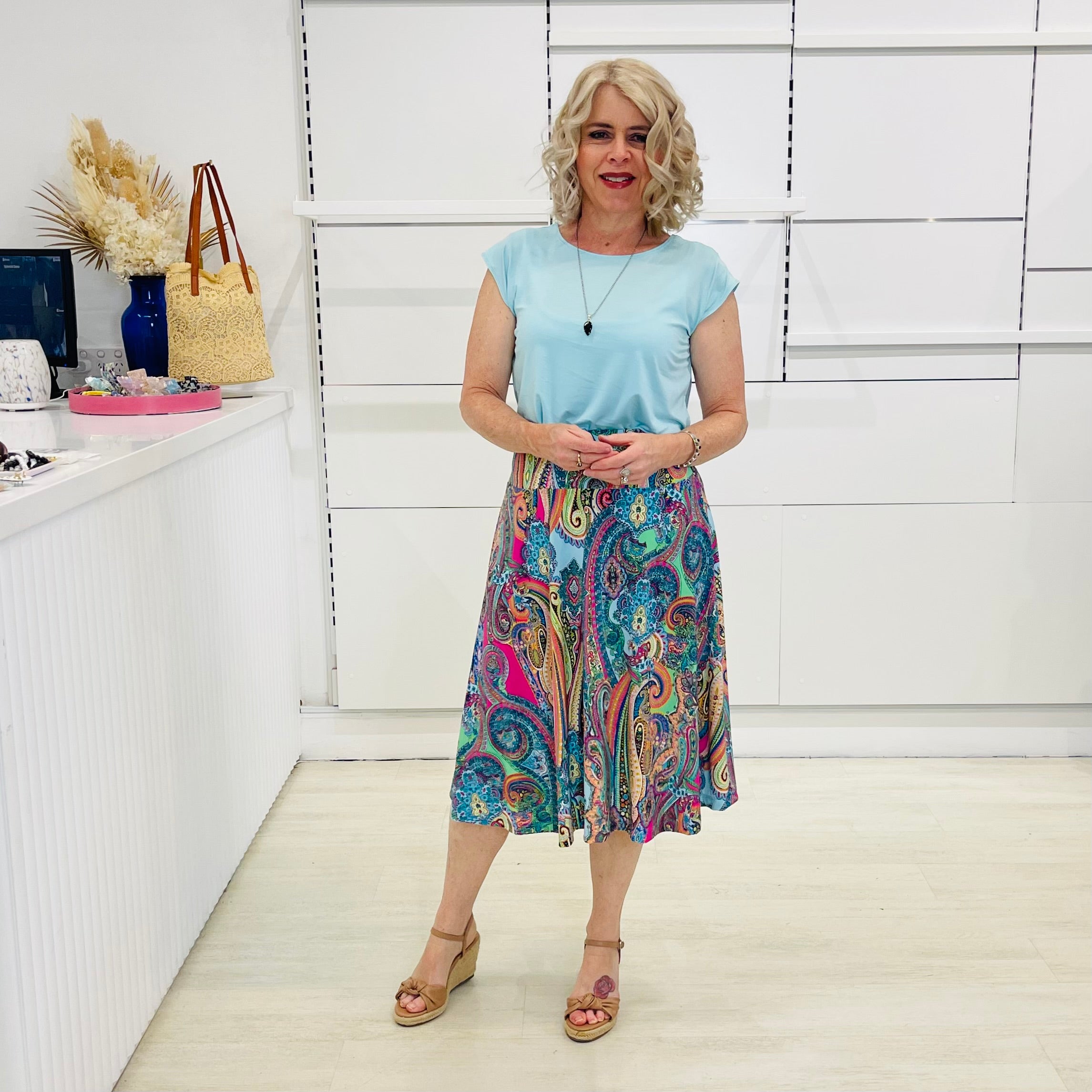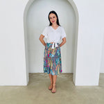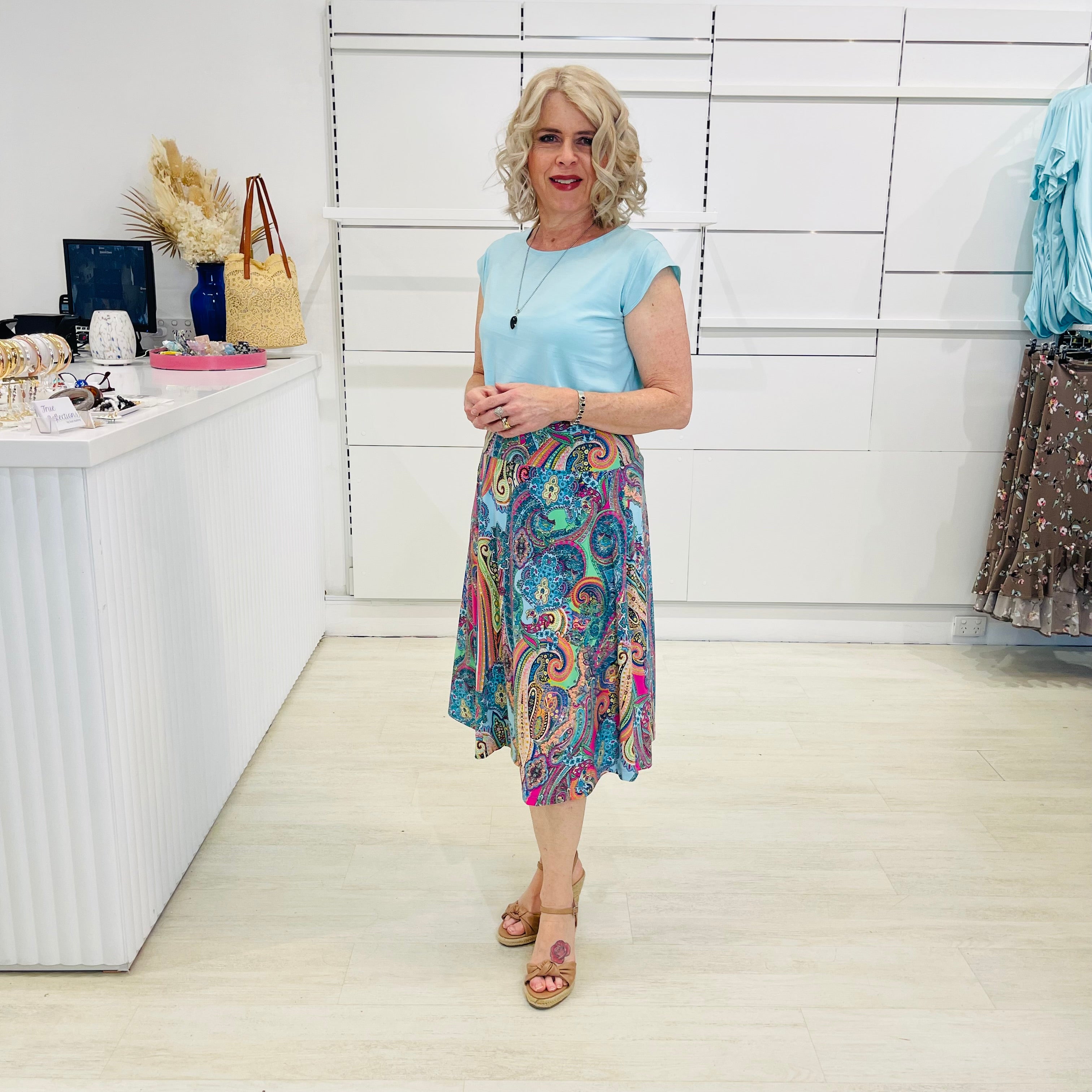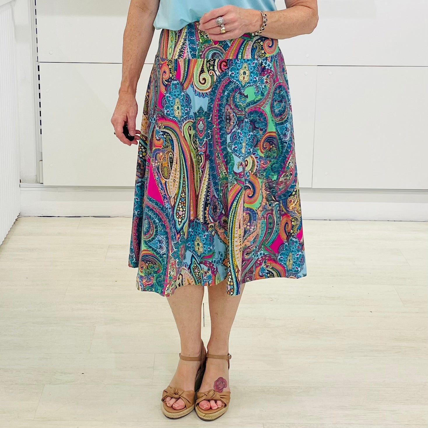 Step into joy with our Rainbow Rhapsody Midi Skirt — a playful swirl of bold paisley in every shade of the rainbow.